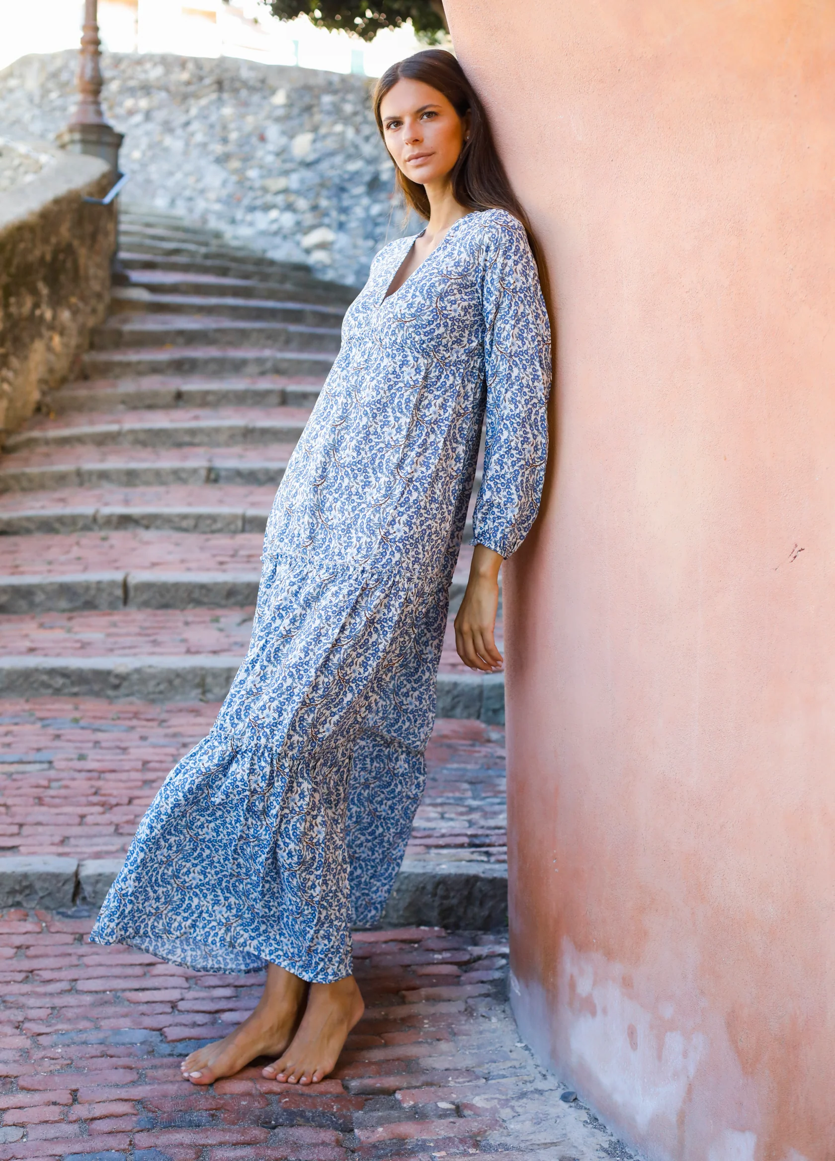 Questo abito a maniche lunghe si distingue per lโampia scollatura a V, che valorizza il dรฉcolletรฉ con delicatezza.
