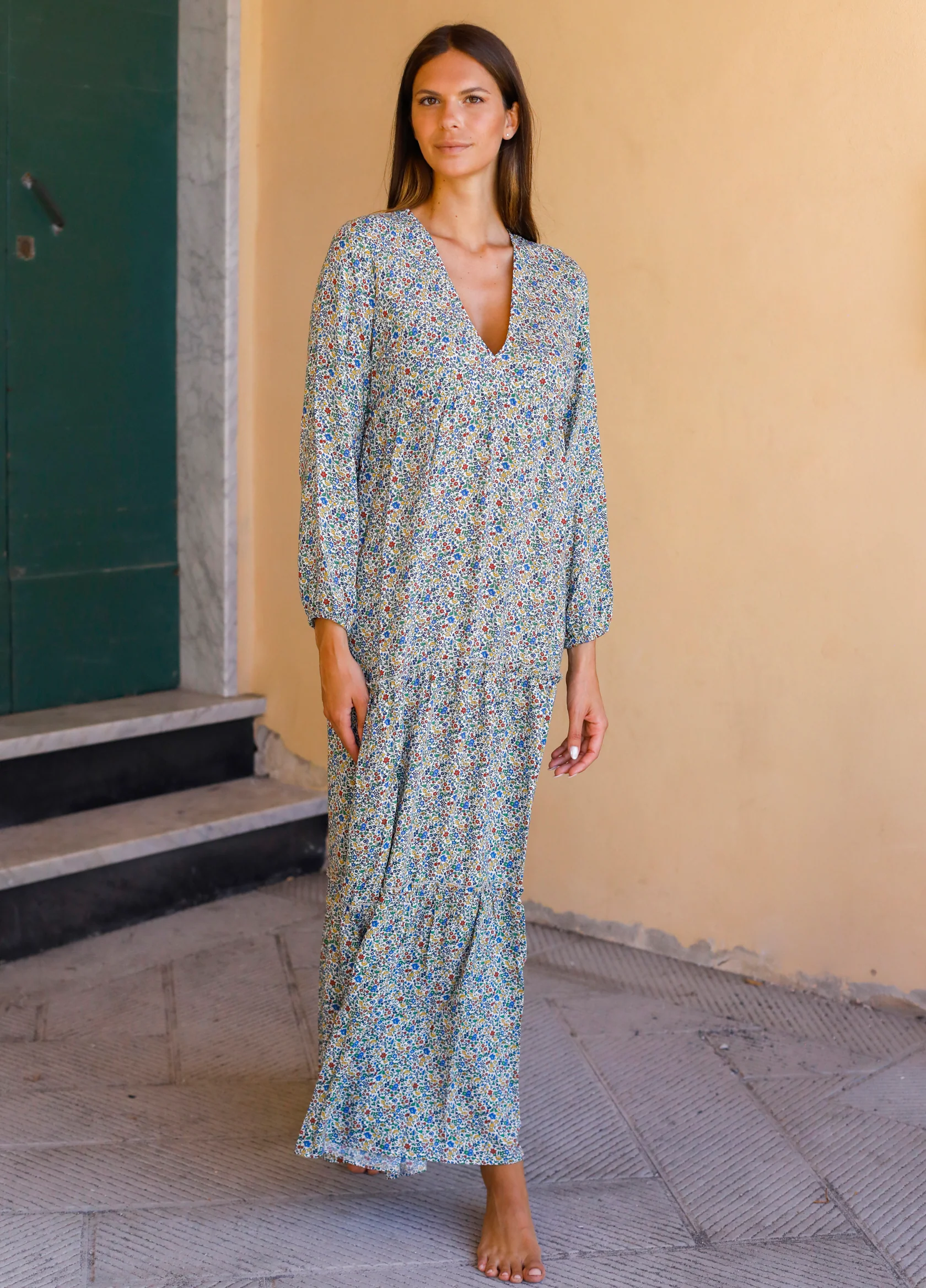 Questo abito a maniche lunghe si distingue per lโampia scollatura a V, che valorizza il dรฉcolletรฉ con delicatezza.