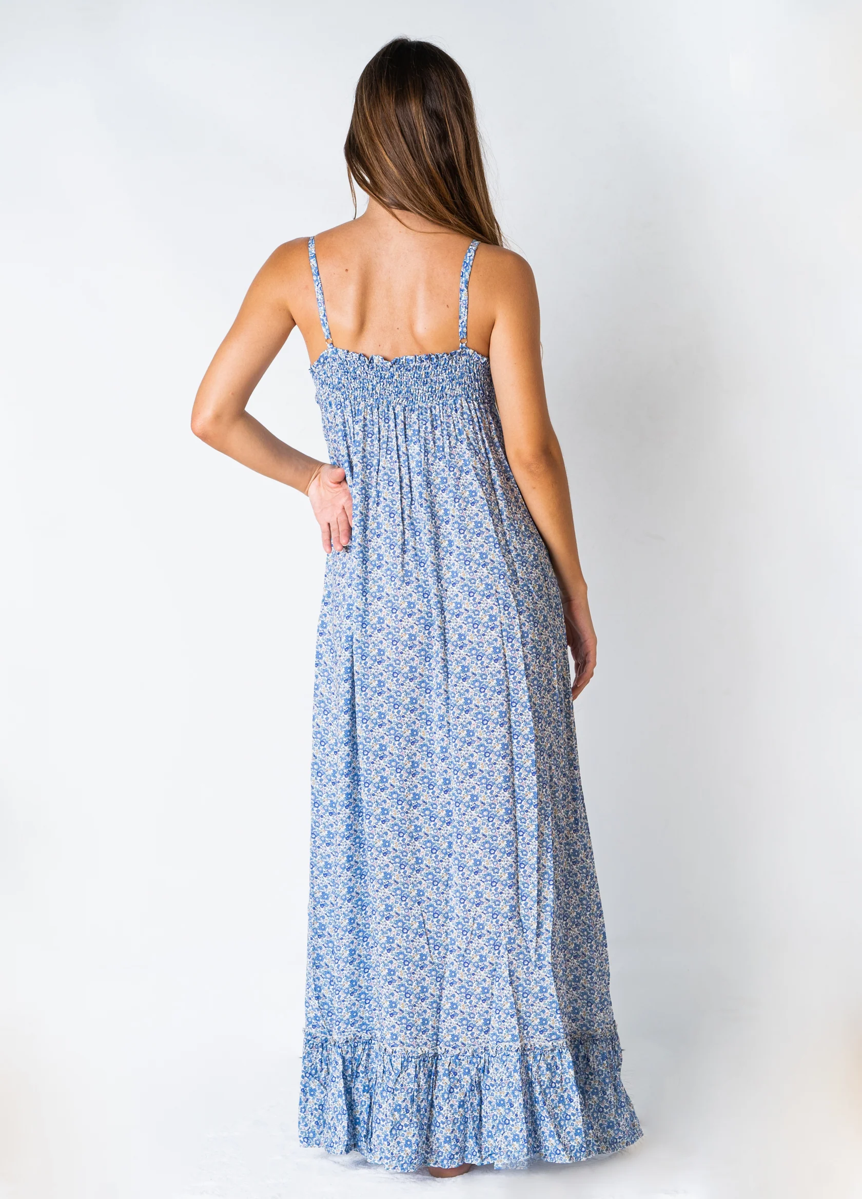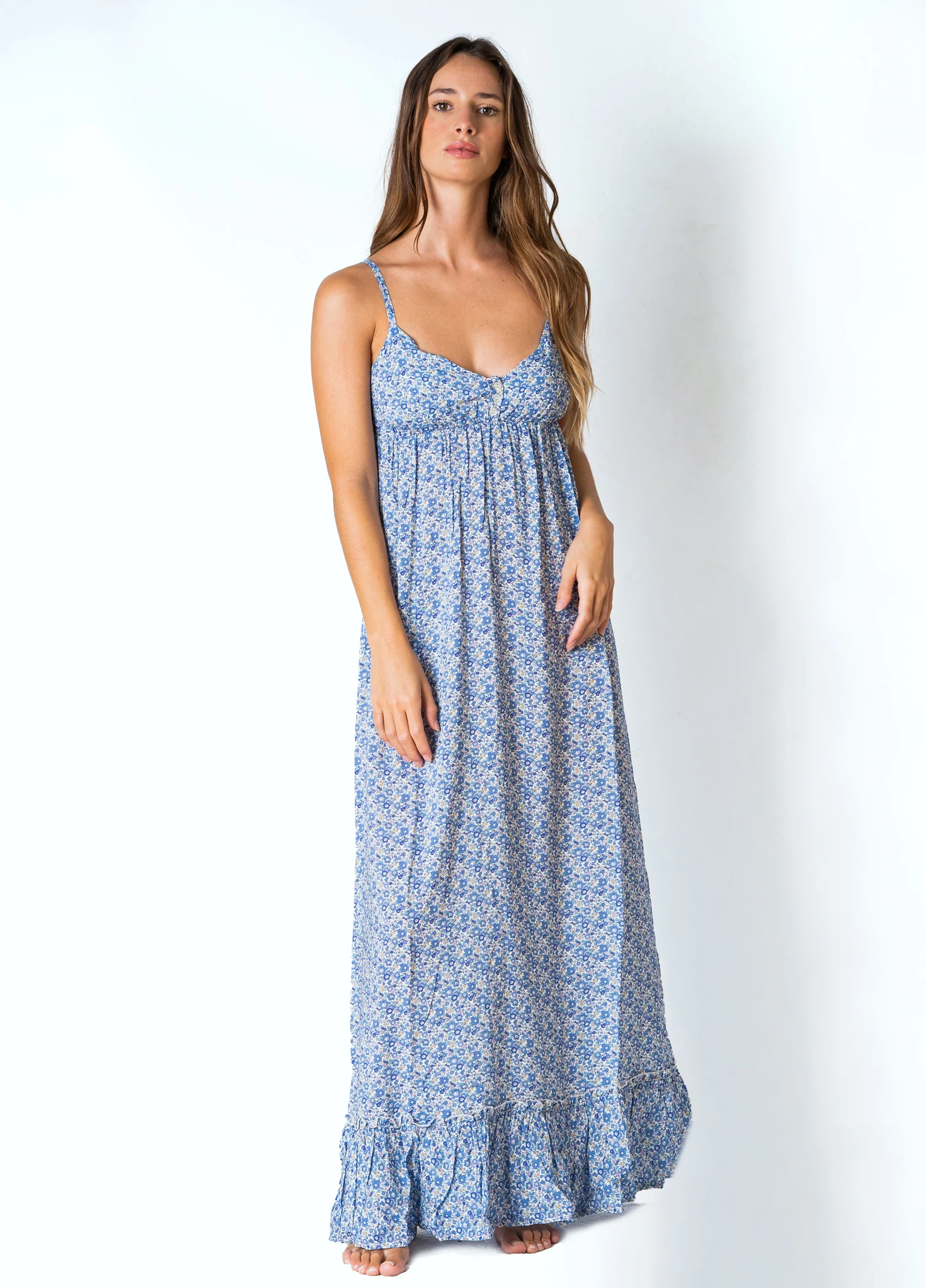 Abito estivo lungo, fantasia liberty floreale con graziose spalline sottili regolabili grazie al cursore. Chiusura a bottoncini sul seno per poi scendere morbido in unโampia gonna con balza sul fondo. Corrispondenza taglie XS=38, S=40, M=42 Composizione tessuto 100% viscosa
