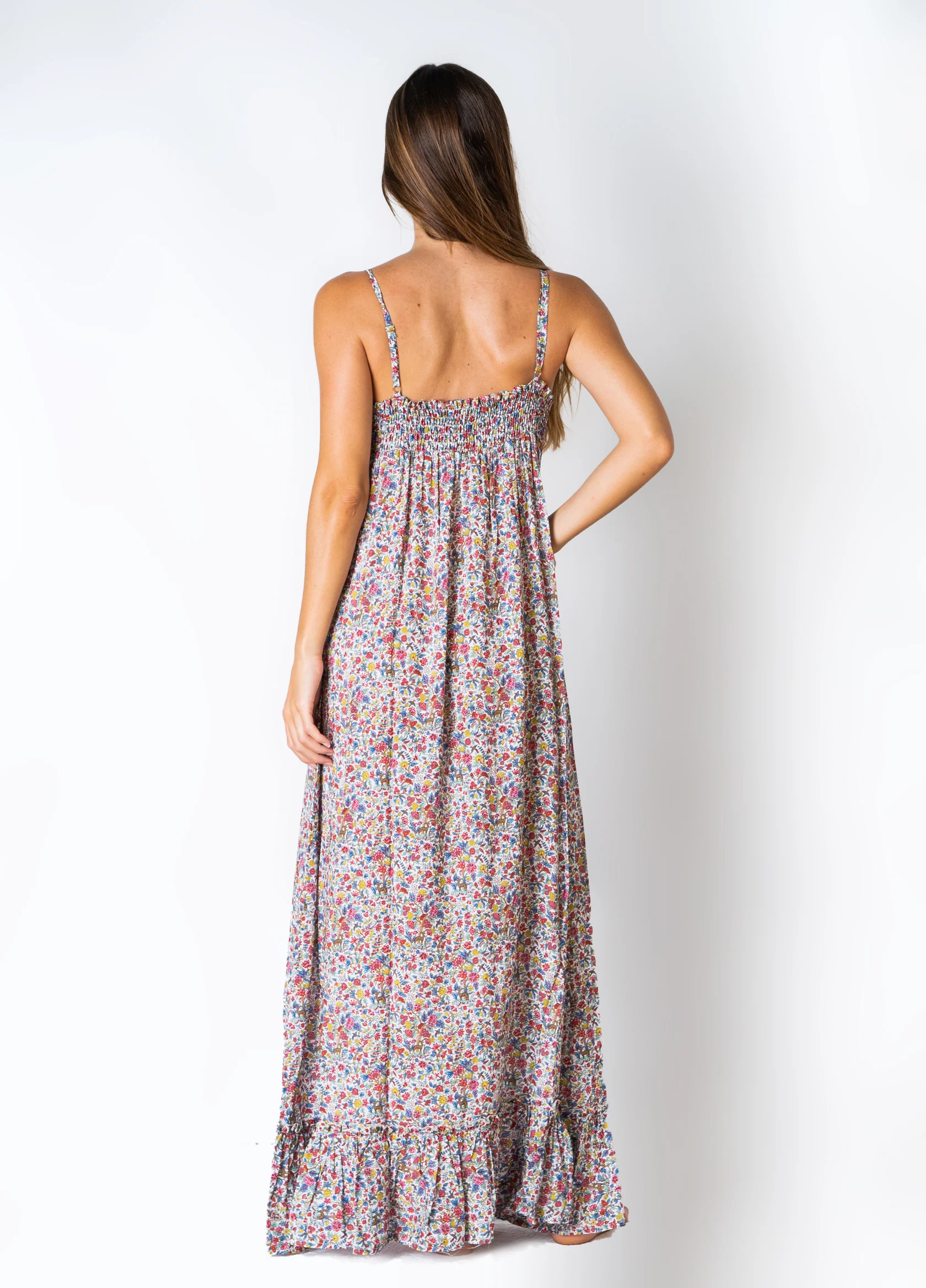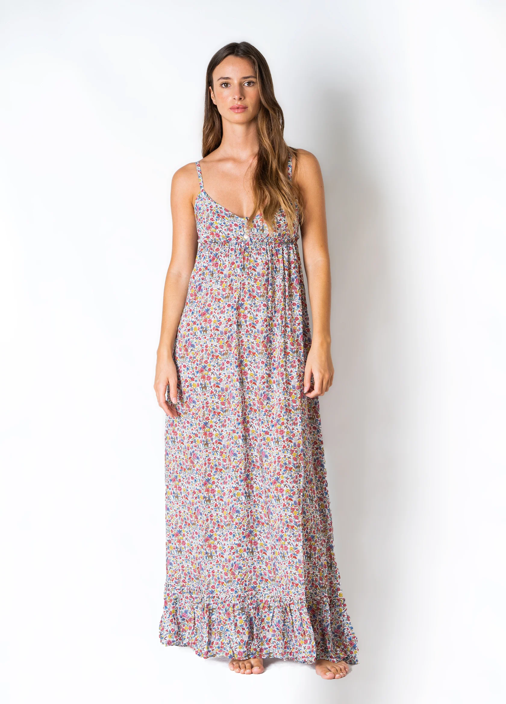 Abito estivo lungo, fantasia liberty floreale con graziose spalline sottili regolabili grazie al cursore. Chiusura a bottoncini sul seno per poi scendere morbido in unโ€™ampia gonna con balza sul fondo. Corrispondenza taglie XS=38, S=40, M=42 Composizione tessuto 100% viscosa