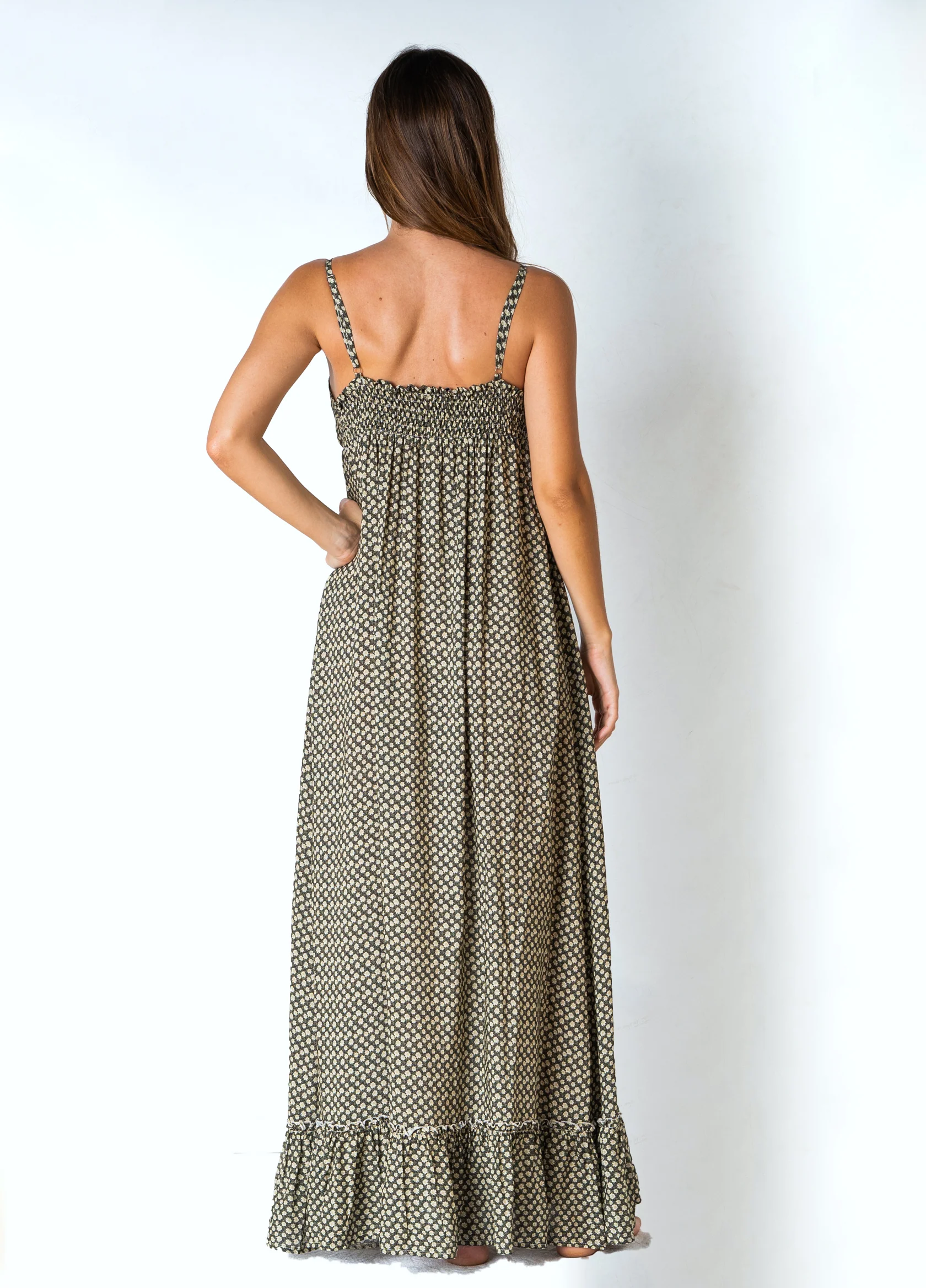 Abito estivo lungo, fantasia liberty floreale con graziose spalline sottili regolabili grazie al cursore. Chiusura a bottoncini sul seno per poi scendere morbido in unโampia gonna con balza sul fondo. Corrispondenza taglie XS=38, S=40, M=42 Composizione tessuto 100% viscosa