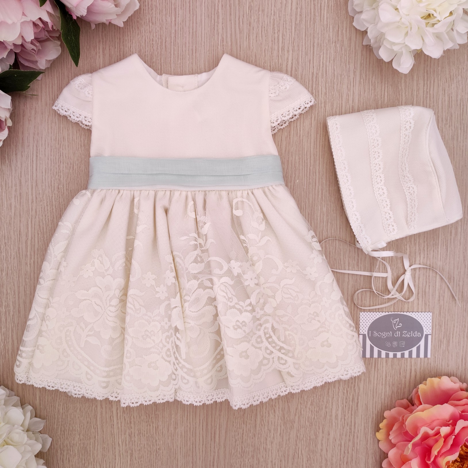 Abito Charo – Panna Verde Acqua con cuffietta 6 mesi, 9 mesi – Fodera: 67% poliestere, 33% cotone; Abito: 100% poliestere – Made in Spain 428 Tul