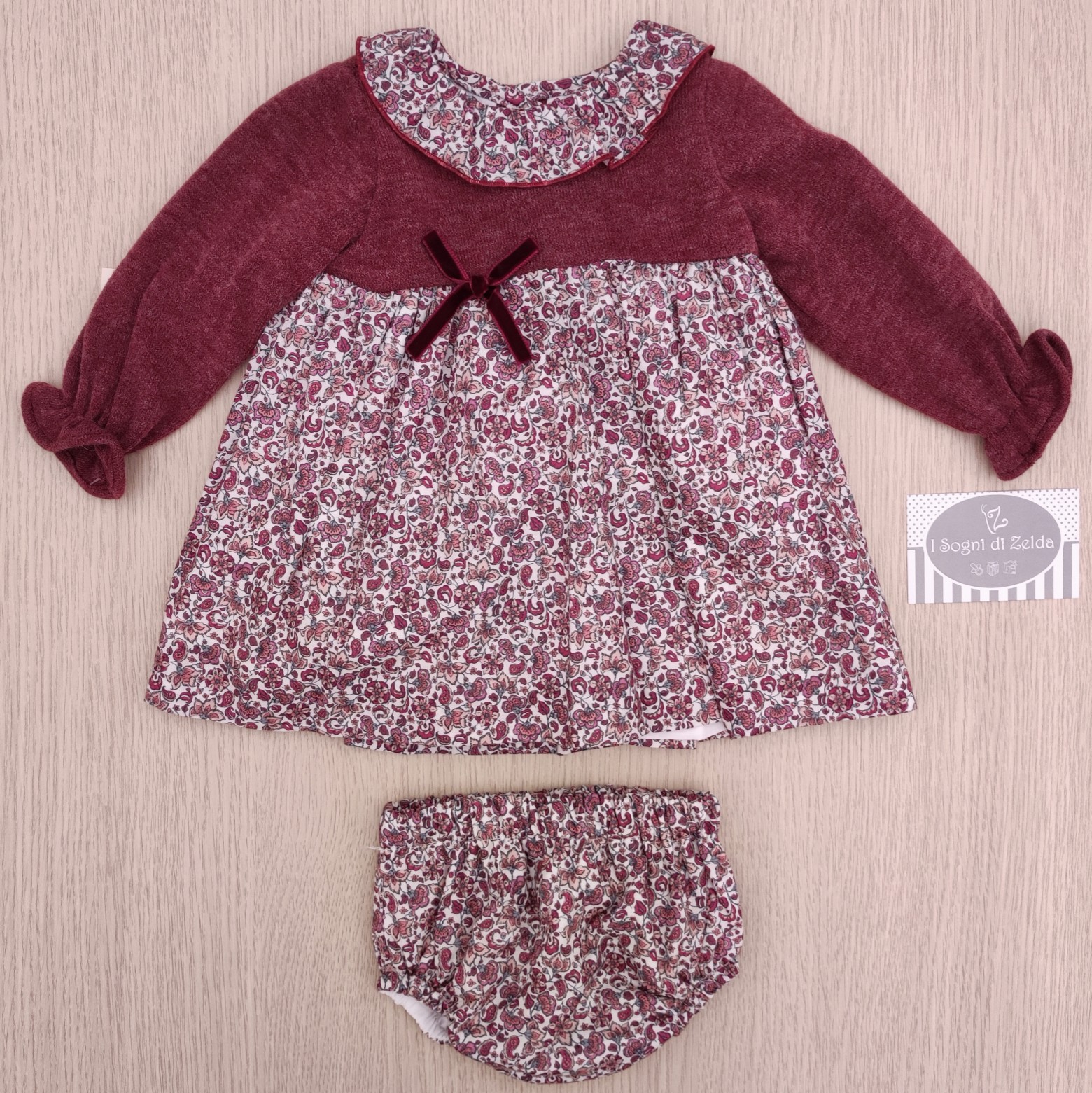 Abito con culotte Cua-Cuak – Bordeaux Fiorellini, con fascia sul retro 6, 9, 18, 36 mesi – 55% cotone, 45% poliestere – Made in Spain