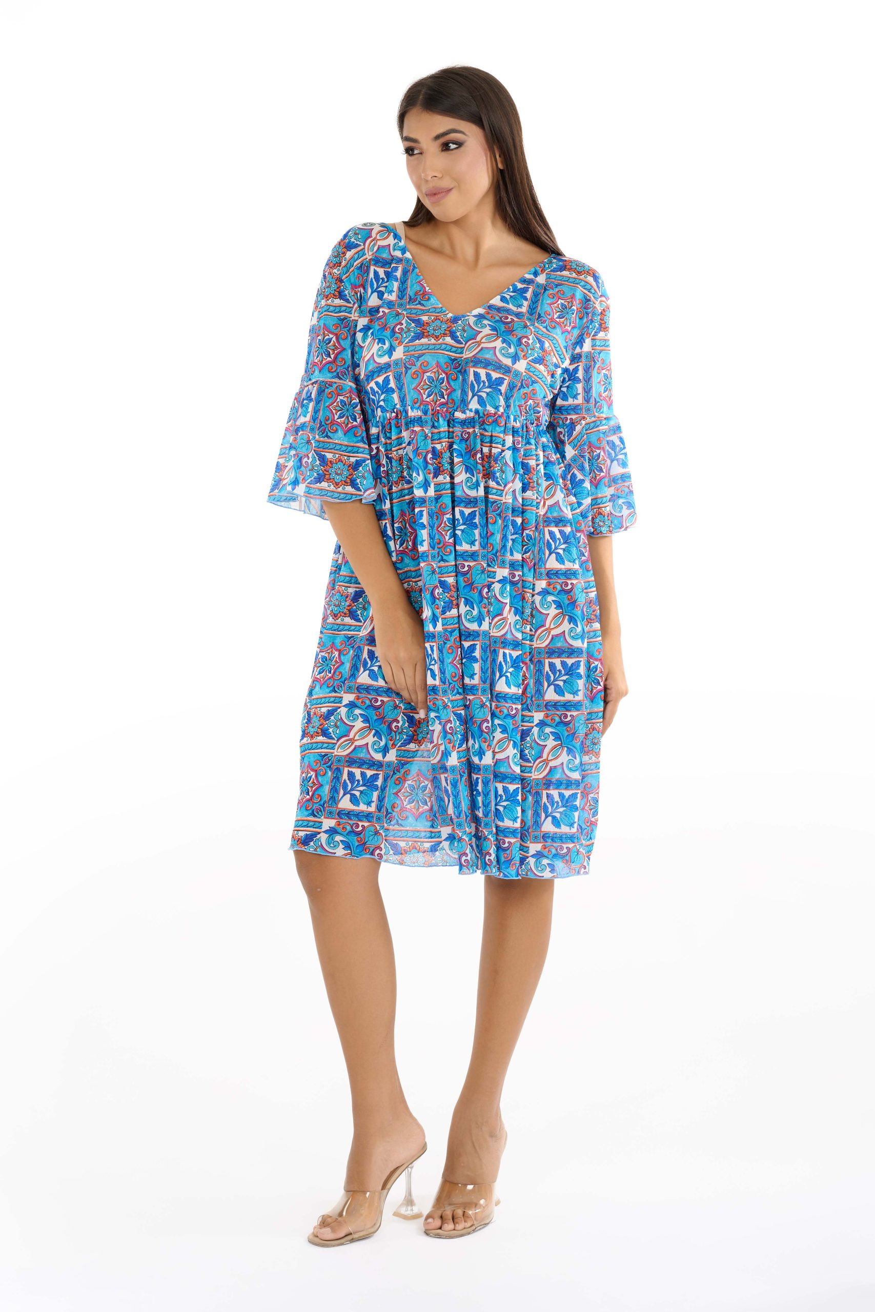 Abito realizzato in morbido chiffon, leggermente trasparente, perfetto come fuoriacqua, per un aperitivo o per una passeggiata nel tuo luogo di vacanza. Veste alla perfezione qualsiasi tipo di fisicità grazie alla lunghezza al ginocchio, le maniche ampie con volants e l’arriccio sul punto vita che valorizza la silouette.