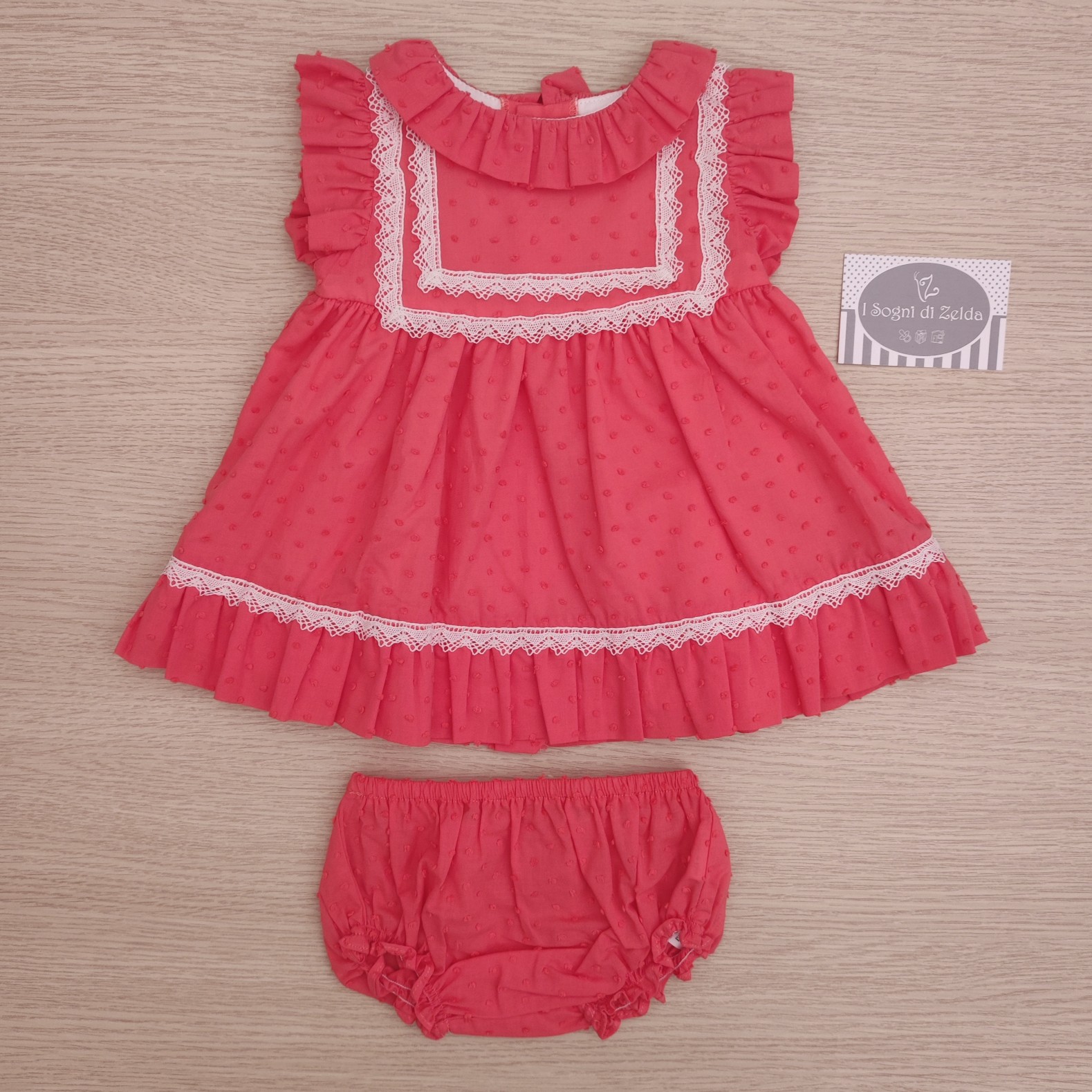 Abito Miranda – Plumetis Corallo con copripannolino 12 mesi – Esterno: 100% cotone; Fodera: 65% poliestere, 35% cotone – Made in Marocco