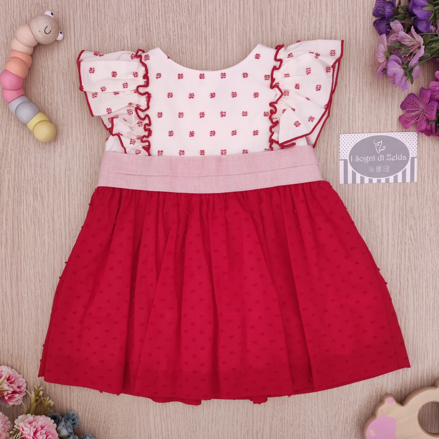 Abito Miranda – Plumetis Rosso 12 mesi – Esterno: 100% cotone; Fodera: 65% poliestere, 35% cotone – Made in Marocco