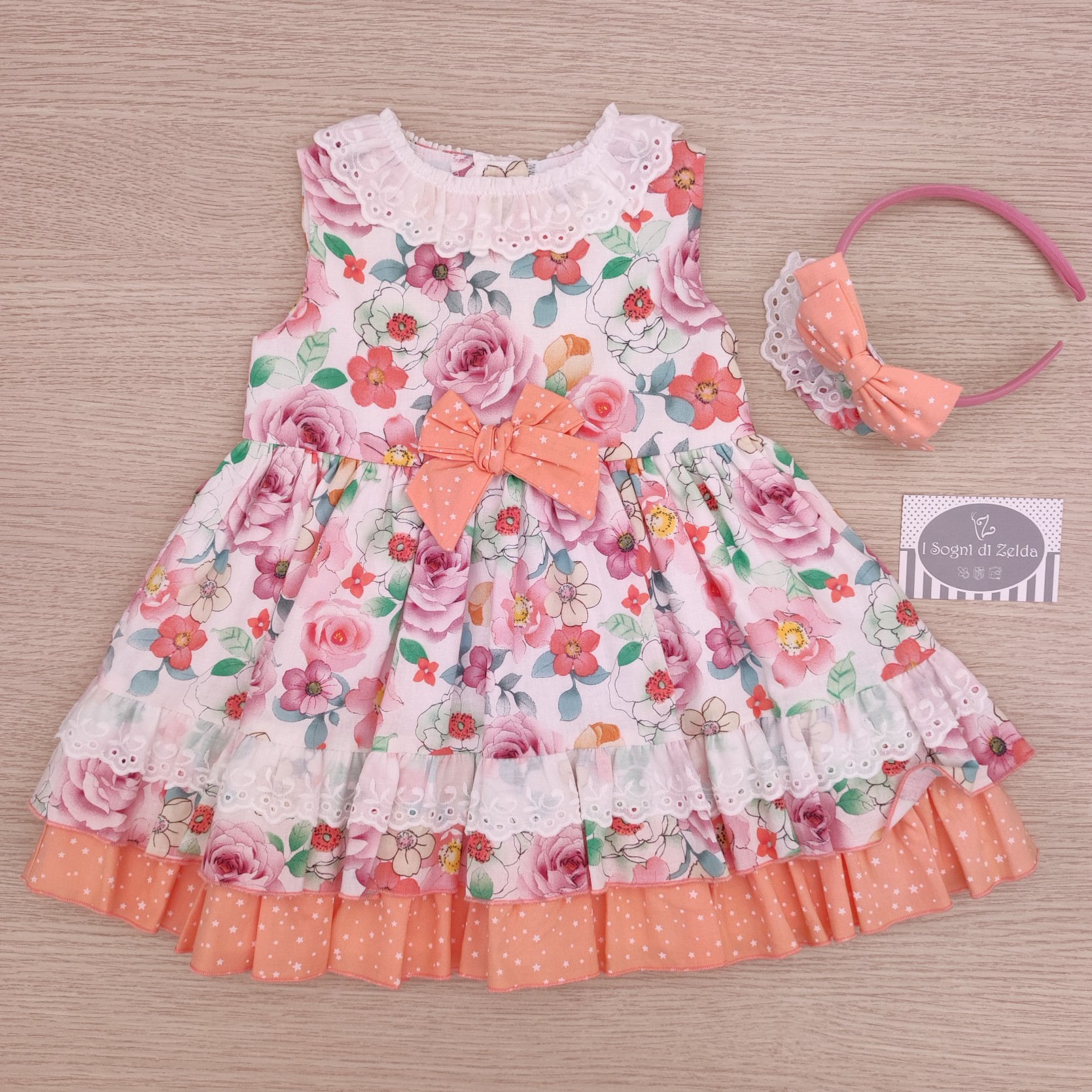 Abito Miranda – Smanicato Fiorato e Arancione Stelline con Cerchietto 12 mesi, 18 mesi – Esterno 55% lino, 45% cotone; Fodera 80% poliestere, 20% cotone – Made in P.R.C.