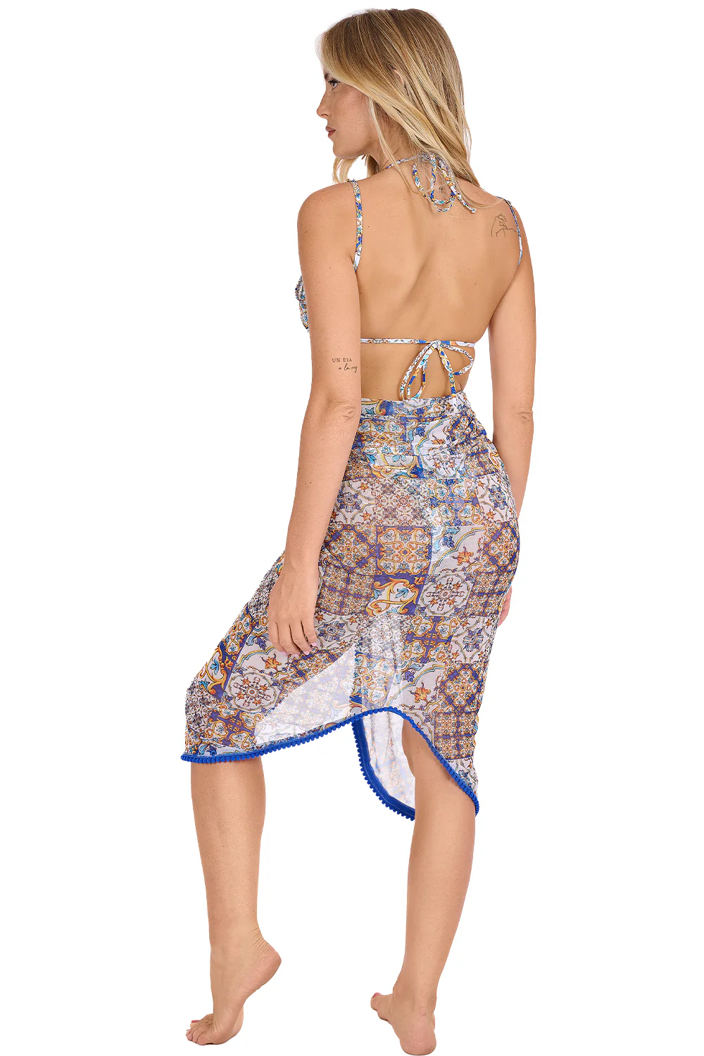 Fuoriacqua in chiffon con bretelline sottili. Si infila sulle spalle e puรฒ essere indossato in tre modi: aperto come una sorta di kimono-pareo, chiuso come un abito oppure incrociato sul punto vita per un effetto piรน stiloso. Comodo e versatile, รจ impreziosito dall’orlo ricamato con delicati ponpon in tinta.
