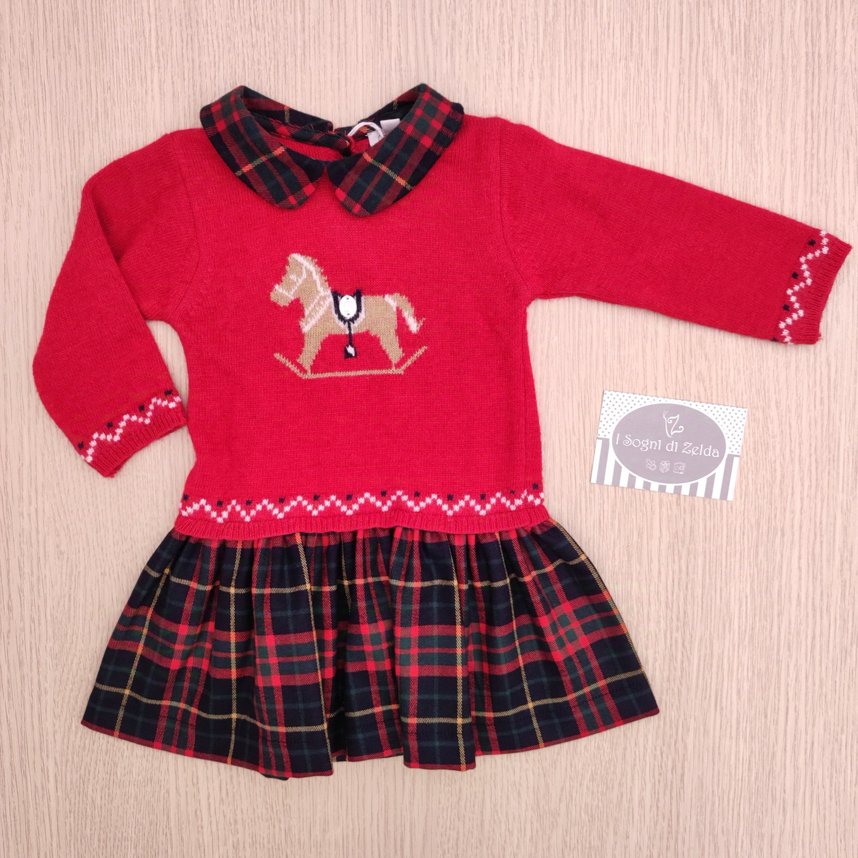 Abito Patachou – Cavalluccio e Tartan 3, 12, 18 mesi – Maglia: 45% viscosa, 25% poliammide, 25% merino, 5% cashmere; Tartan: 65% poliestere, 29% viscosa, 2% elastane – Made in Portugal