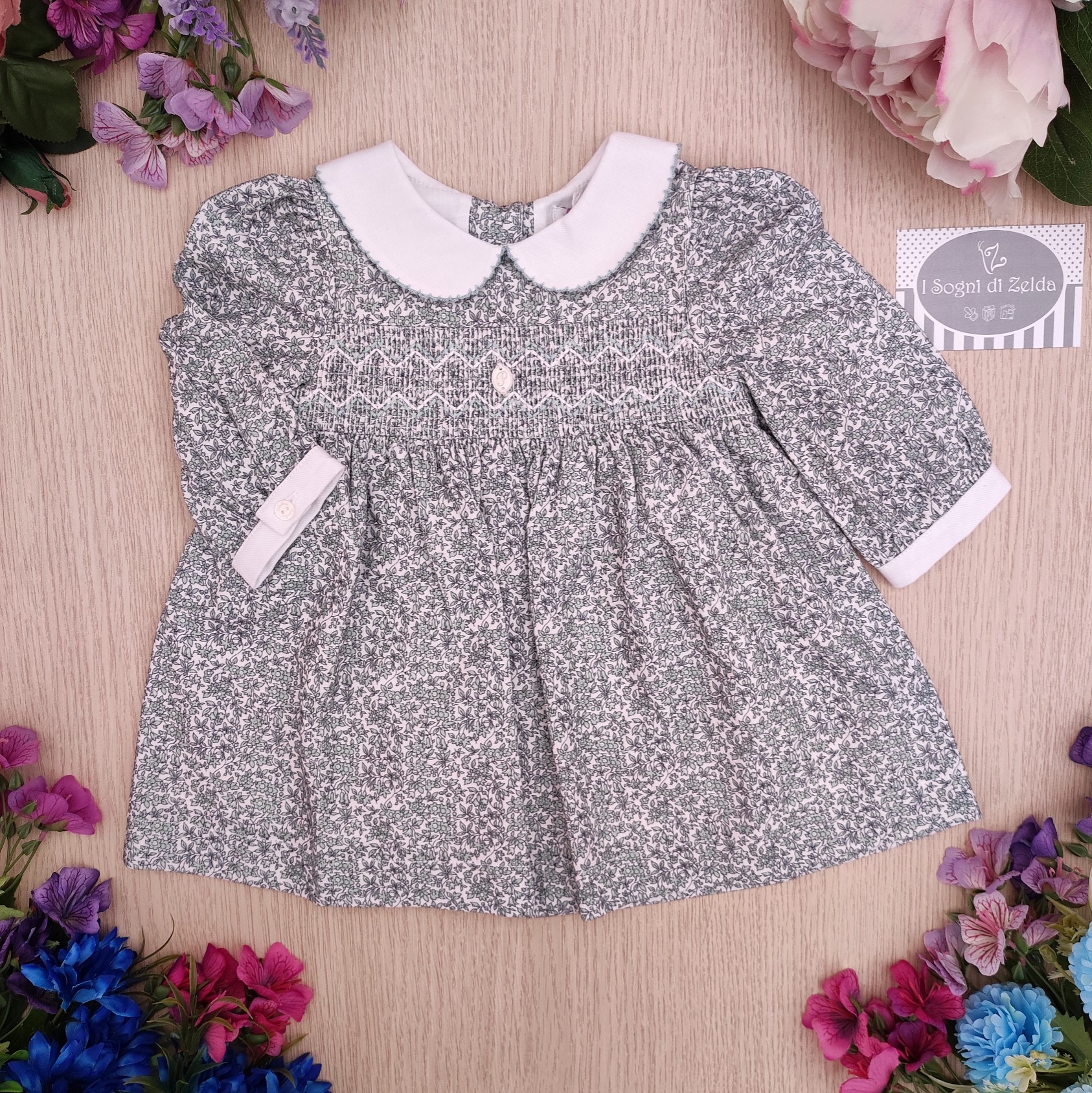 Abito Patachou – Fiorellini Verdi Punto Smock in vellutino leggero 3 mesi – 100% cotone – Made in Portugal