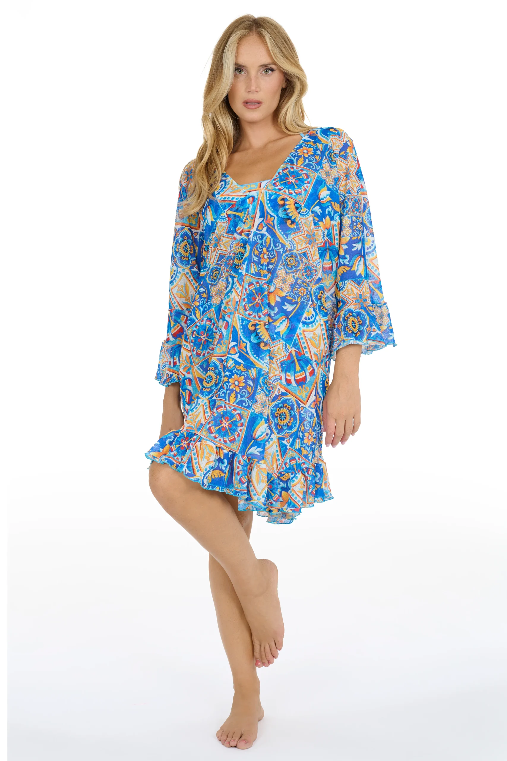 Abito fuoriacqua in chiffon con manica ampia, lunghezza al ginocchio. Impreziosito da eleganti rouches per uno stile unico ed elegante. Il capo must-have per le tue vacanze, 100 Made in Italy con lavorazione artigianale.
