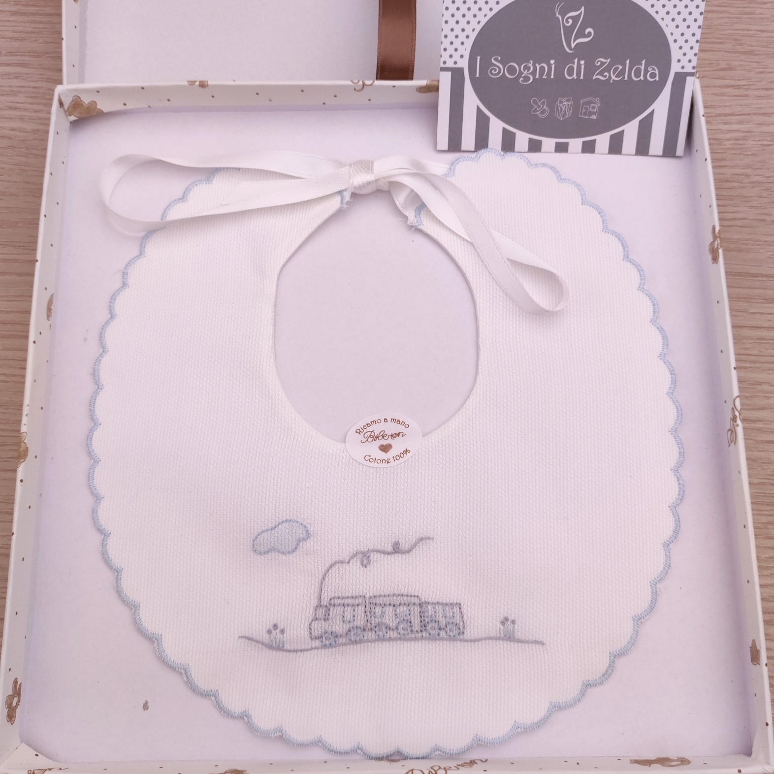 Bavaglino Bianco Ricamato a mano – Trenino Celeste