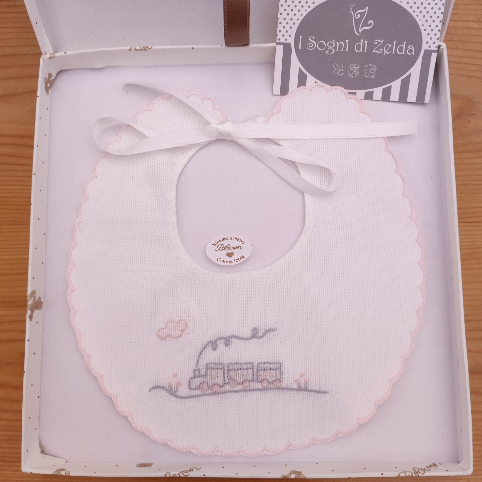Bavaglino Bianco Ricamato a mano – Trenino Rosa