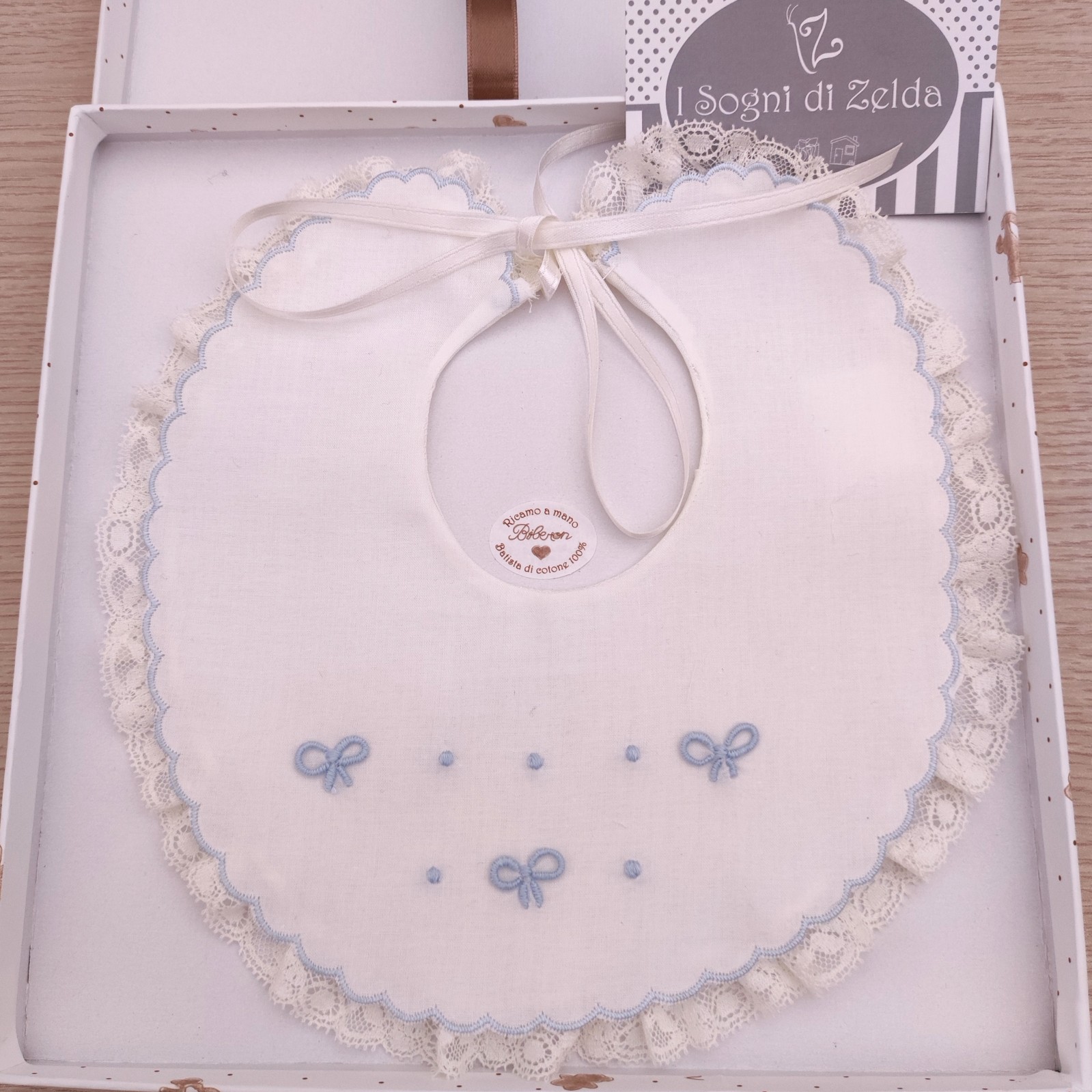 Bavaglino Panna Ricamato a mano – Nodi d’Amore e Pois Celeste In batista di cotone, doppiato, con pizzo valenciennes – 100% cotone – Made in Italy Cod: 709