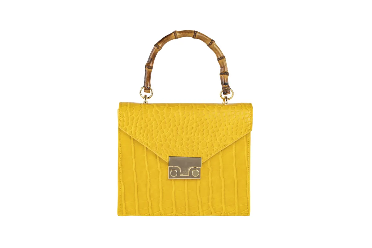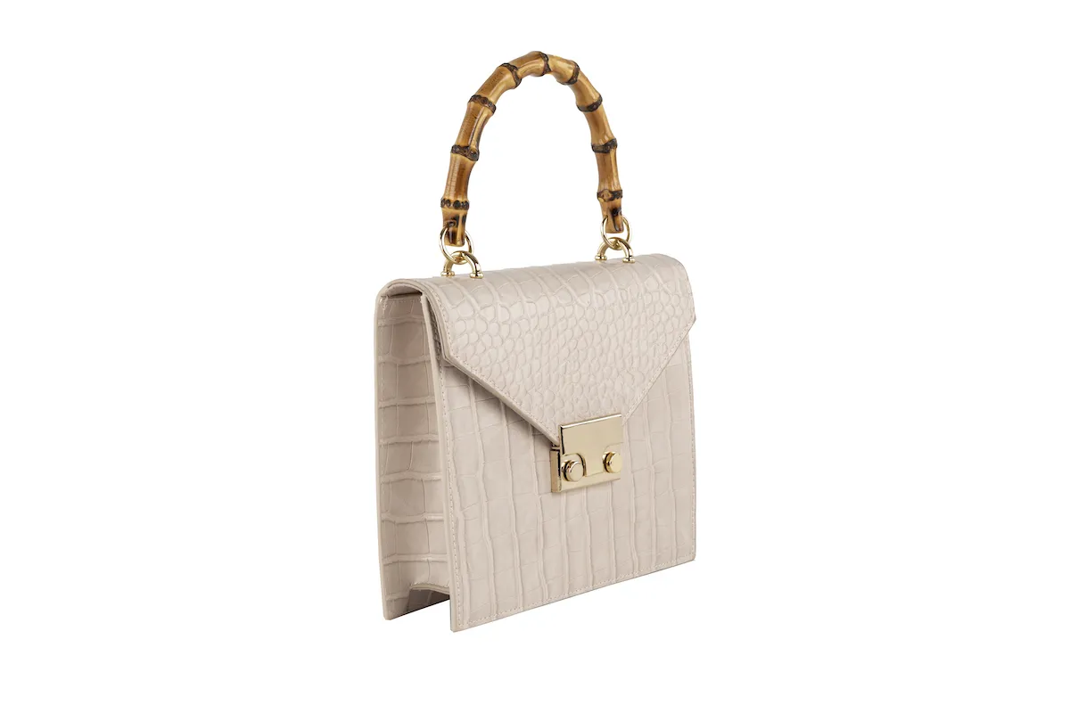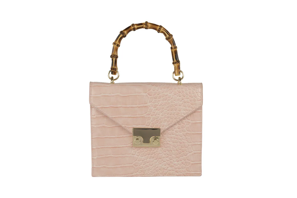 Borsetta in ecovernice stampata cocco con manico in bambรน, catenella interna.