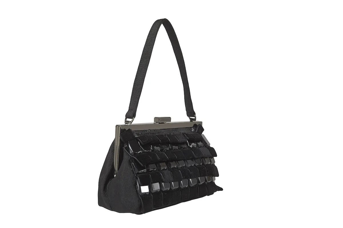 borsetta style retro in grograin con decorazioni in velluto e pietre ideale per serate eleganti.