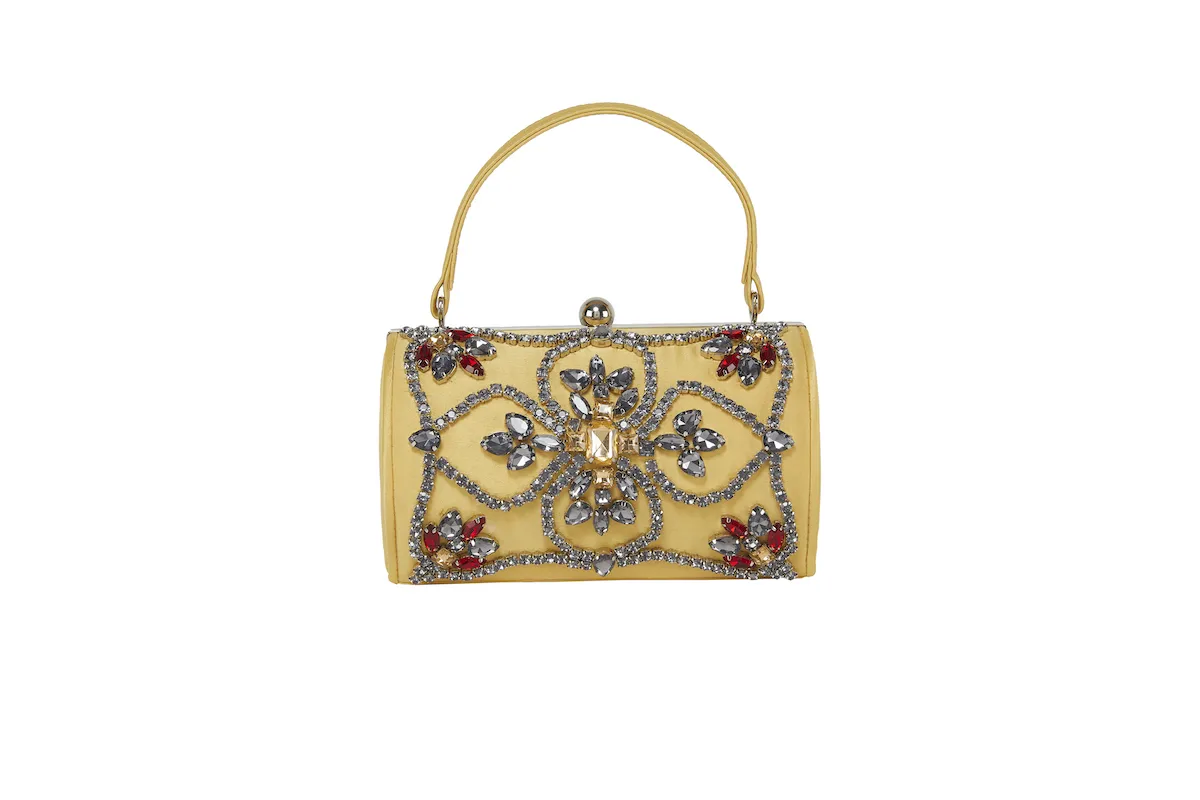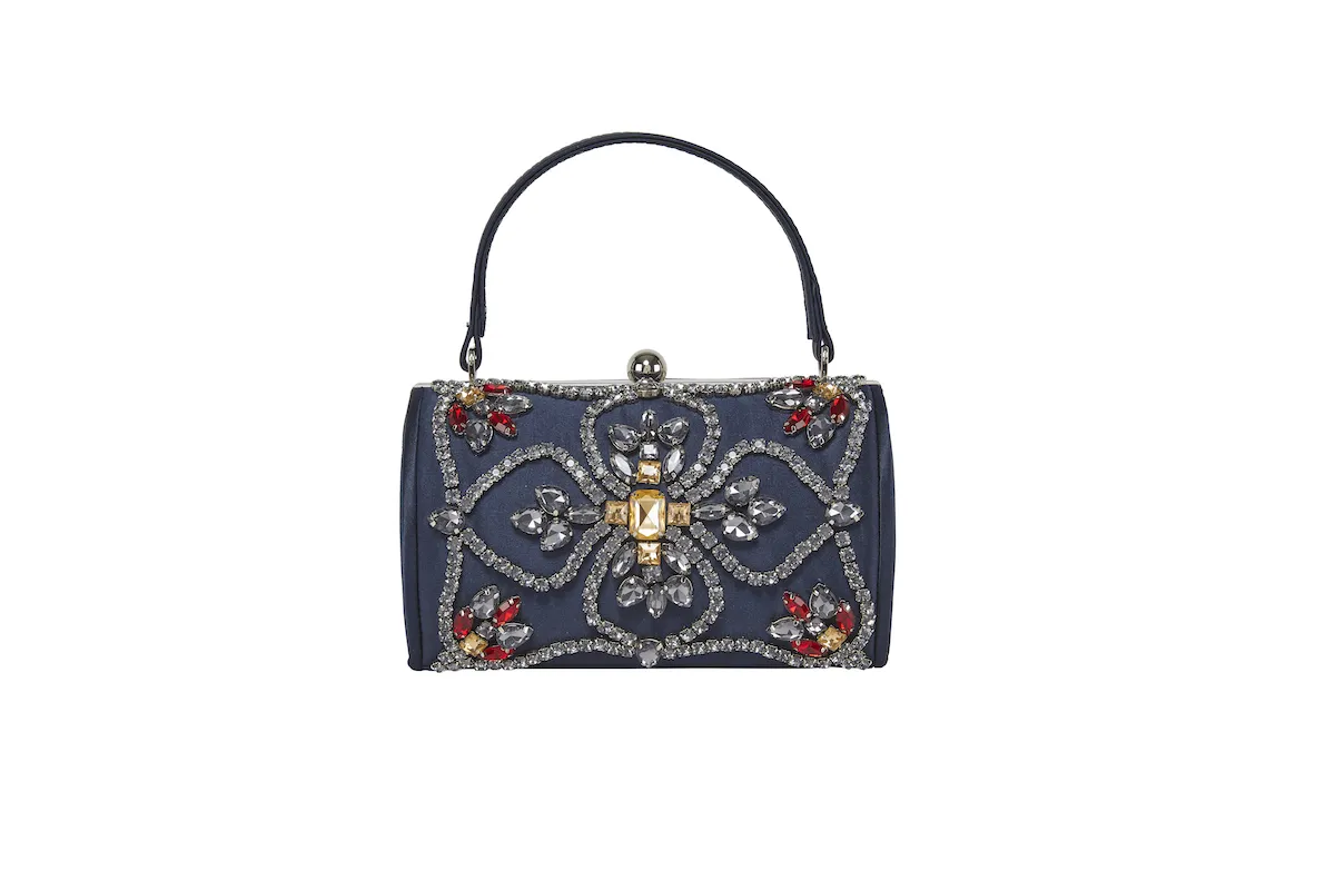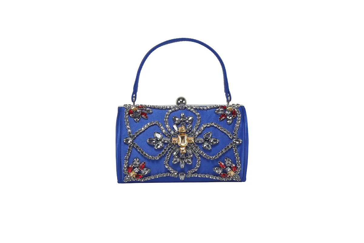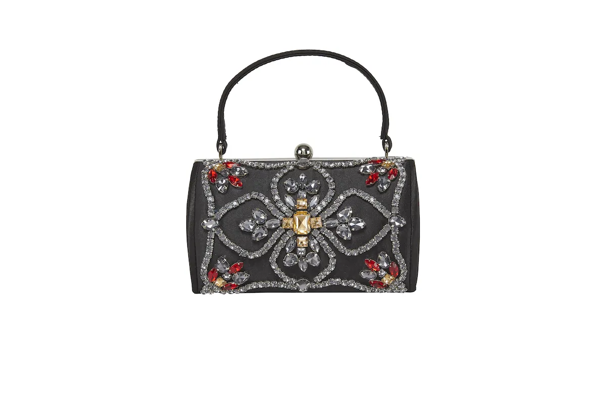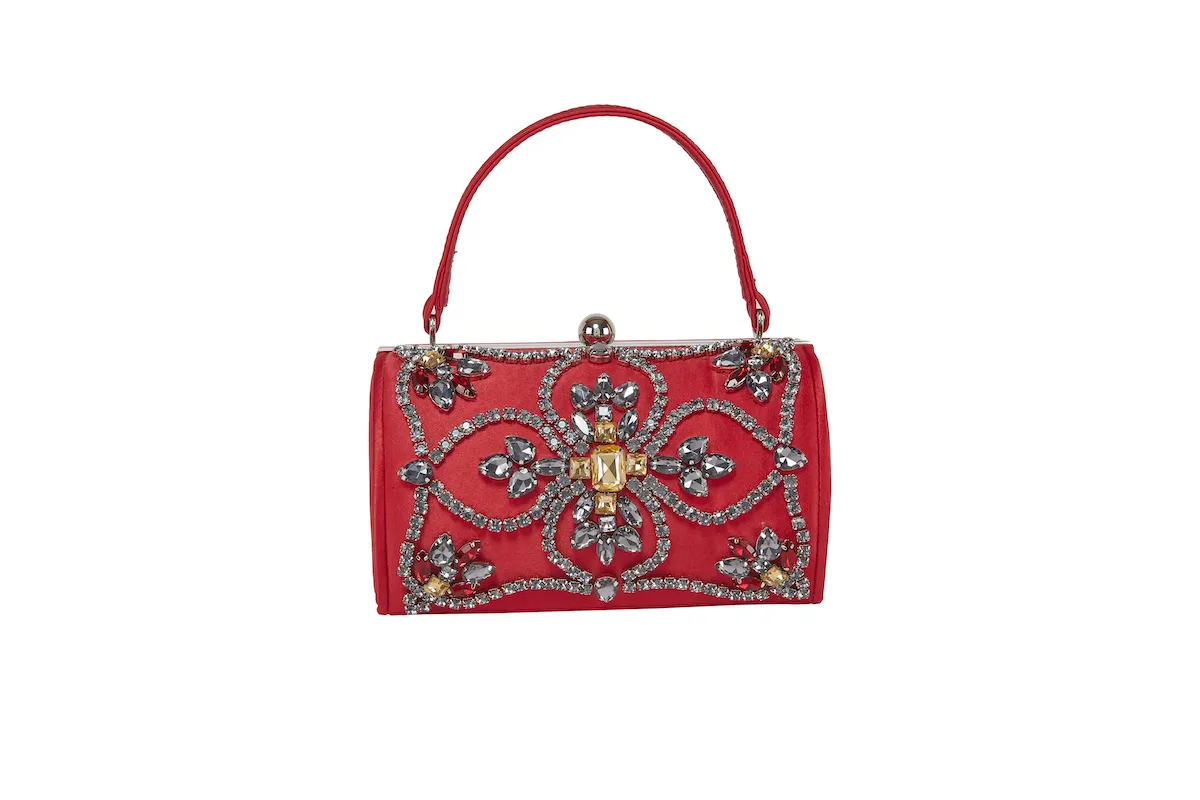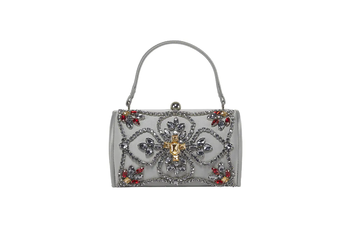 Deliziosa e originalissima borsetta ย in raso, con decoro in pietre e strass ideale per tutte le occasioni, fornita di catena applicabile. Disponibile in varie colorazioni.