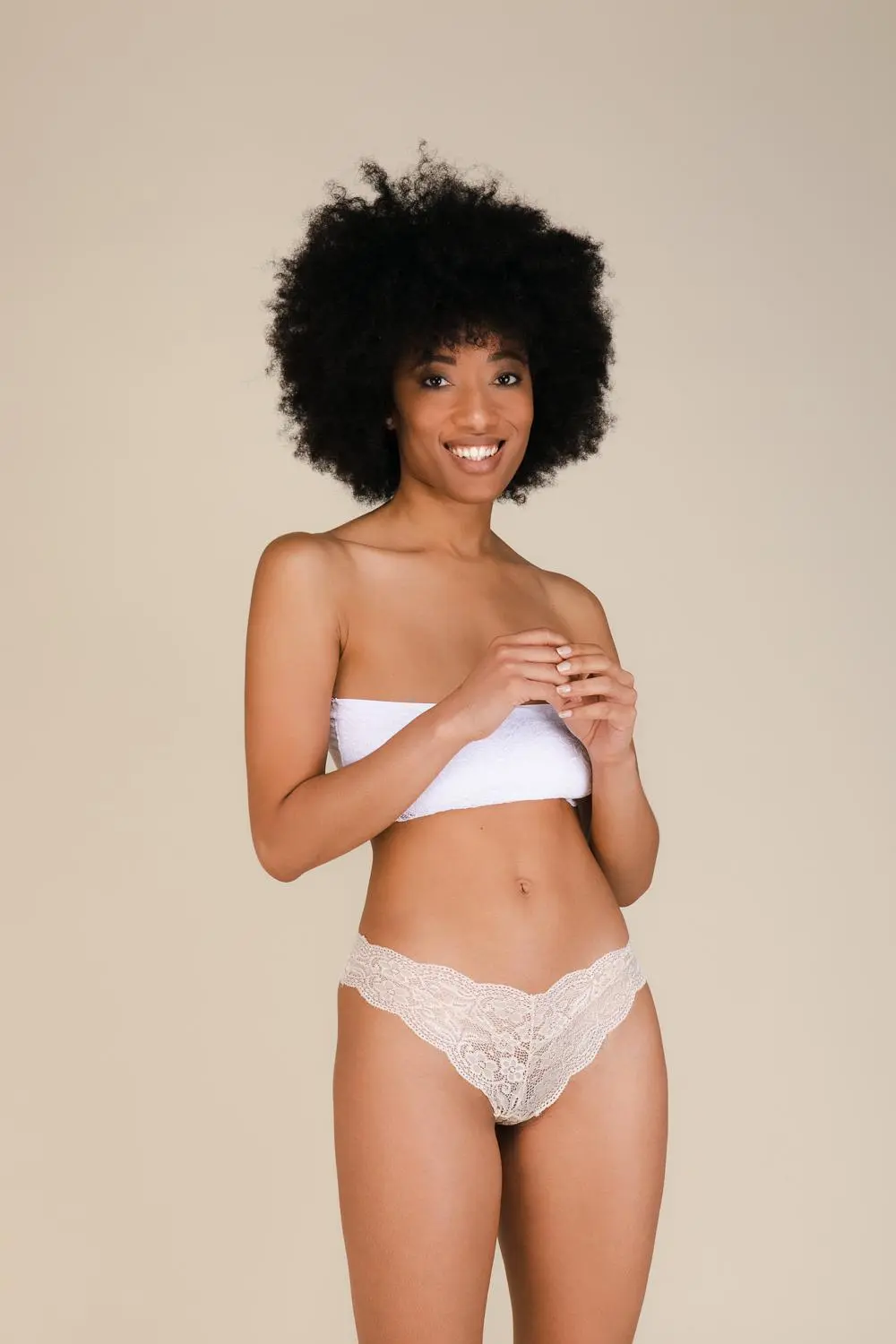 Brasiliana a vita bassa in pizzo smerlato a motivo floreale, che aderisce delicatamente alla pelle. 100% made in Italy Pizzo certificato OEKO-TEXยฎ โ GUIDA ALLE TAGLIE