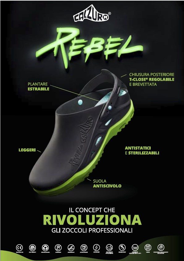 REBEL è realizzato con una mescola di termo-tecno polimeri privi di alogeni e latex-free che inibiscono la proliferazione di funghi e batteri.