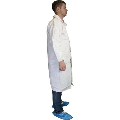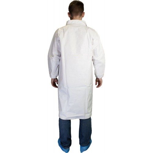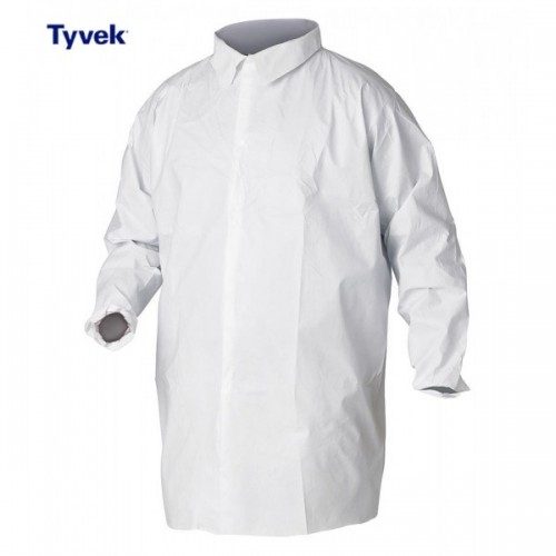 Tyvek Type 5/6 Labcoat รจ un camice di 2/3 di lunghezza completo di colletto.