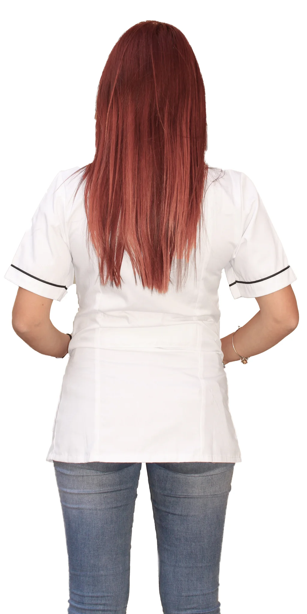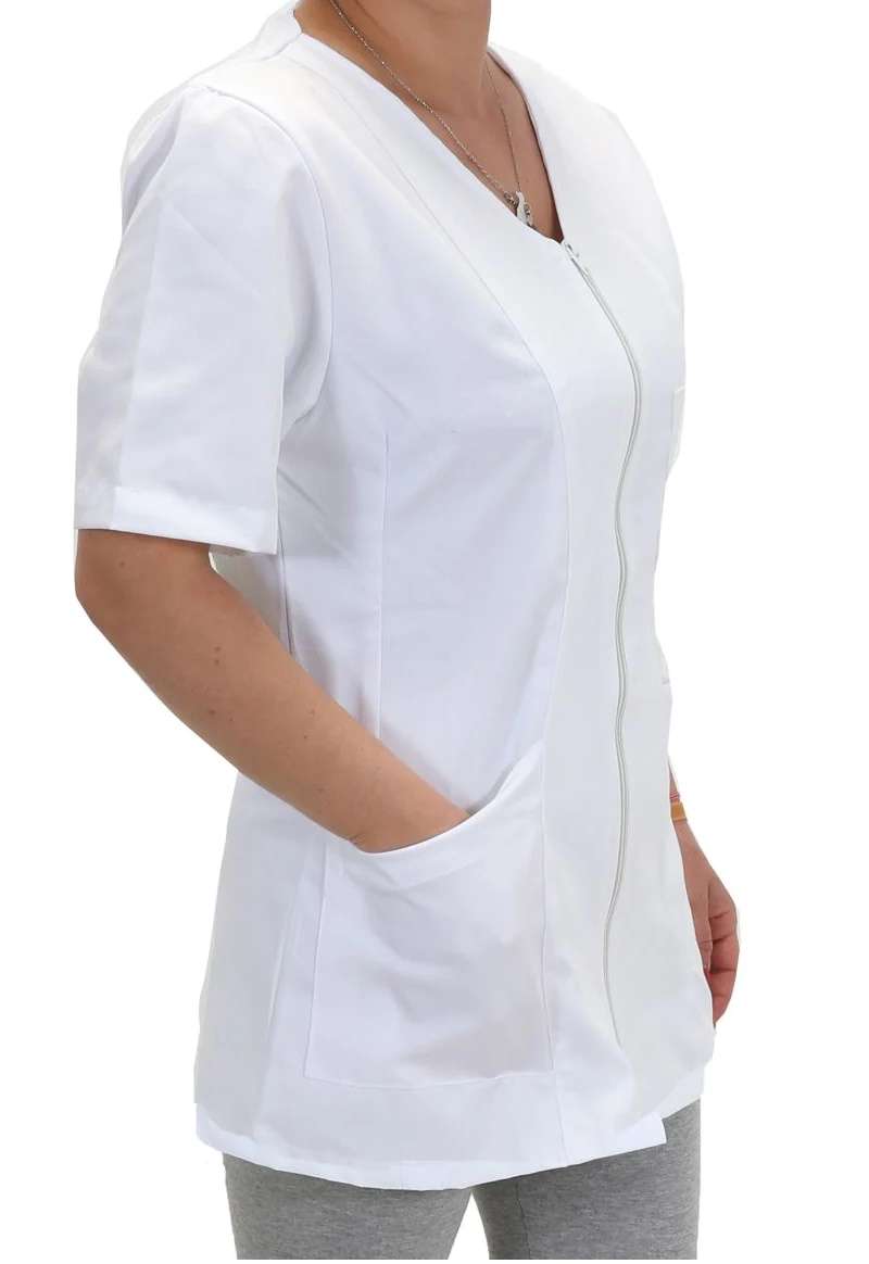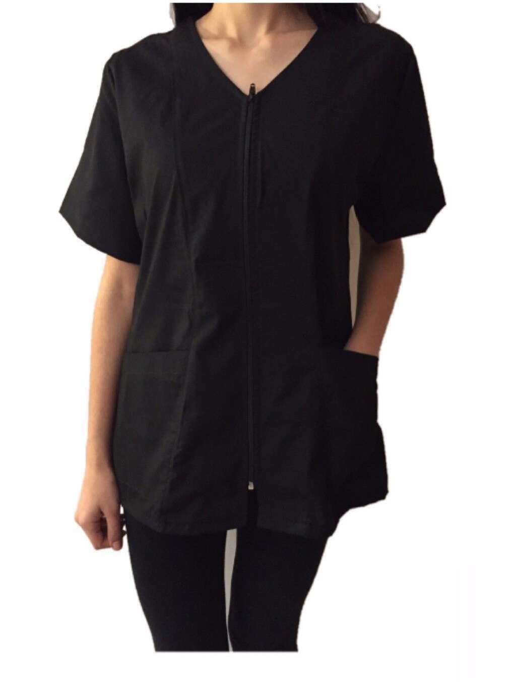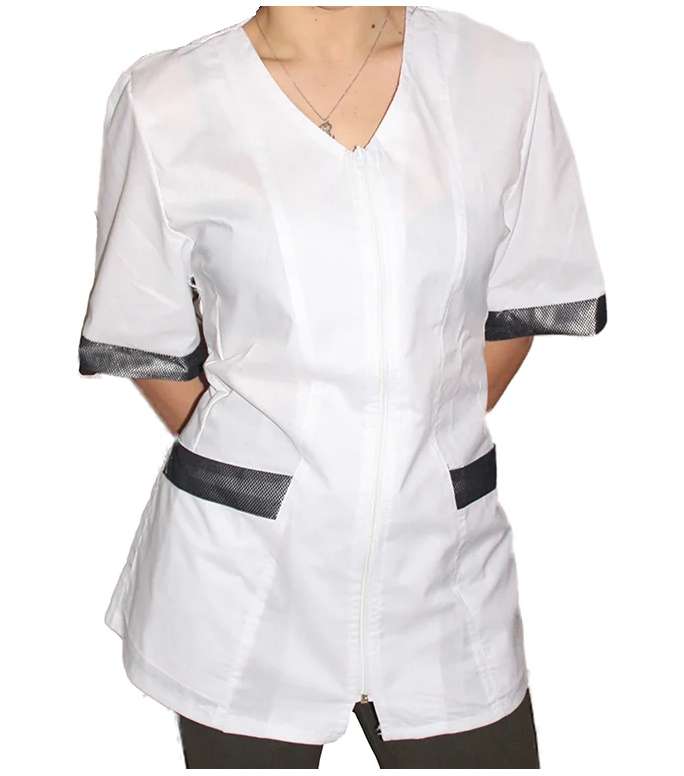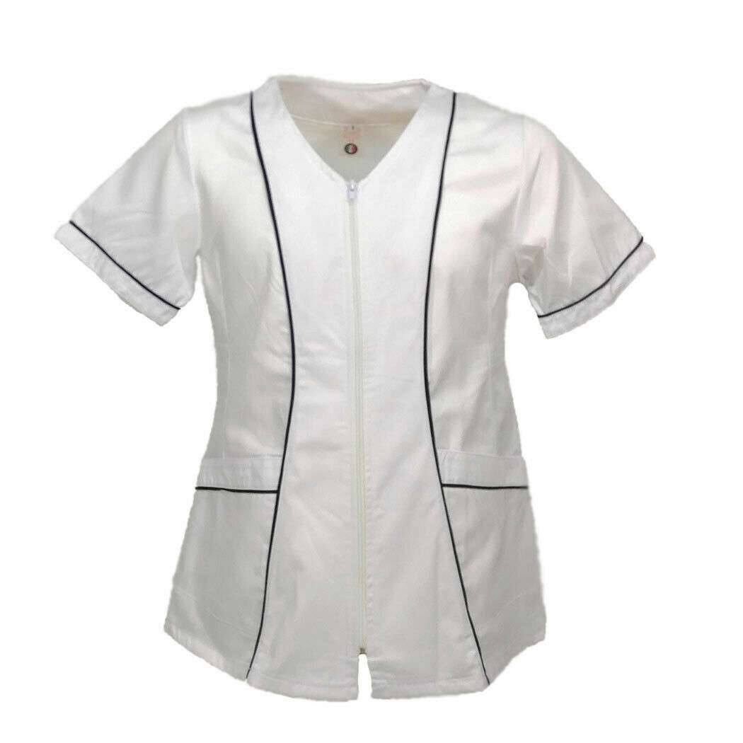 Camice con zip Outlet Casacca Manica Corta Vestibilitร Slim Chiusura anteriore con zip Due tasche avanti Modello in tinta unita Colori solo in Bianco o Nero Modelli Con profili a Contrasto Tessuto 65% poliestere 35% cotone Guarda Tabella Taglieย