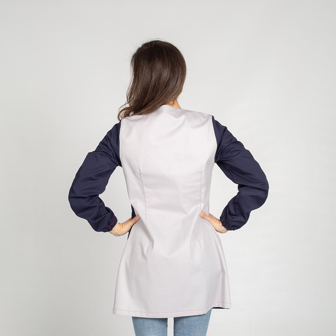 Le pinces sul petto e sulla schiena offrono una vestibilitร comoda che valorizza la figura e garantisce il comfort per tutta la giornata lavorativa.