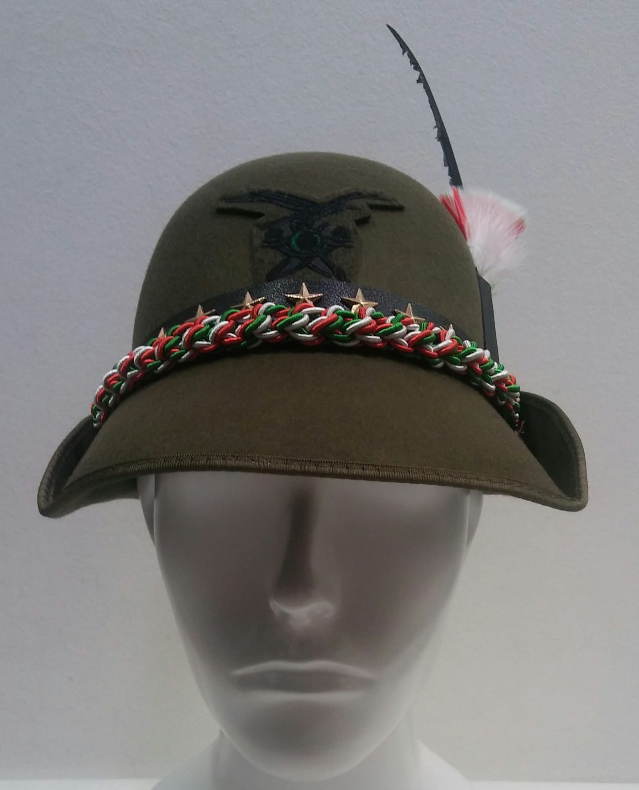 Cappello da congedo ideale per adunata Alpini Materiale: 100% LANA Taglie disponibili: dalla 46 alla 60 (solo taglie pari). Il cappello รจ come da foto, completo di fregio, piumotto tricolore e penna nera economica. |