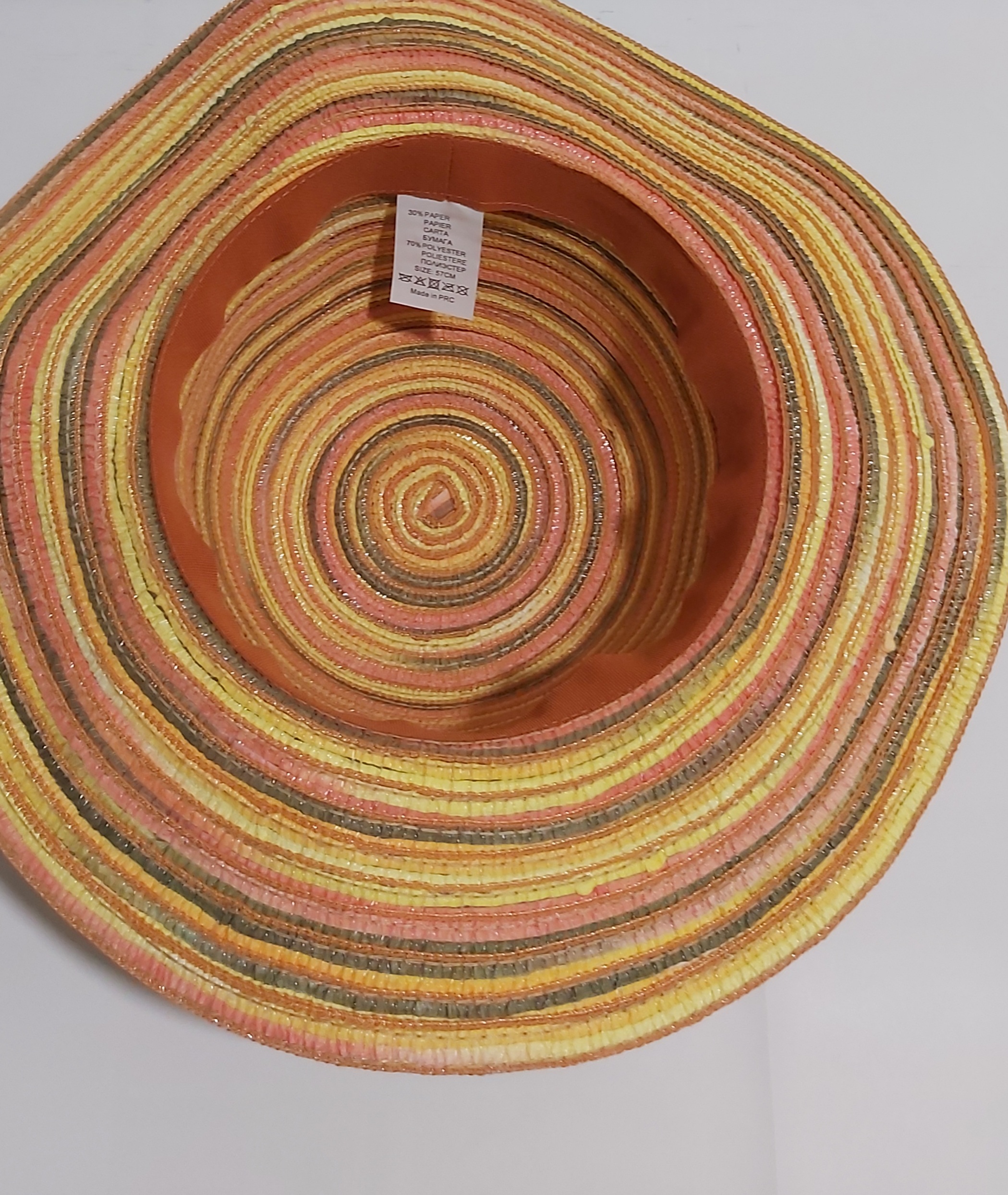 CAPPELLO DONNA MISURA 57 30% CARTA 70% POLYESTER RIGHE ARANCIO COME FOTO TESA LARGA 7,5 CM Per prendere la vostra misura di cappello dovete misurare la circonferenza della testa un centimetro circa sopra l’orecchio. Nella valutazione della misura considerate che: 1. Meglio un cappello leggermente abbondante (massimo una mezza misura in più) piuttosto che uno […]
