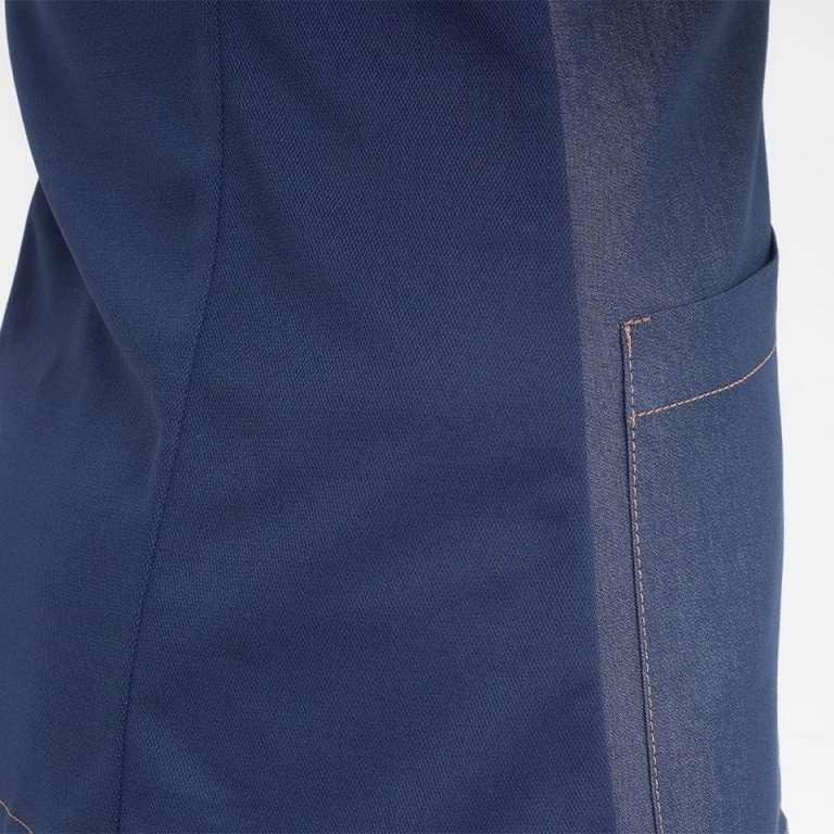 Tessuto jeans morbido di media grammatura, abbinato alla classica maglia piquet, anch’essa dalla mano morbida, traspirante e di rapida asciugatura, presente nel dietro.