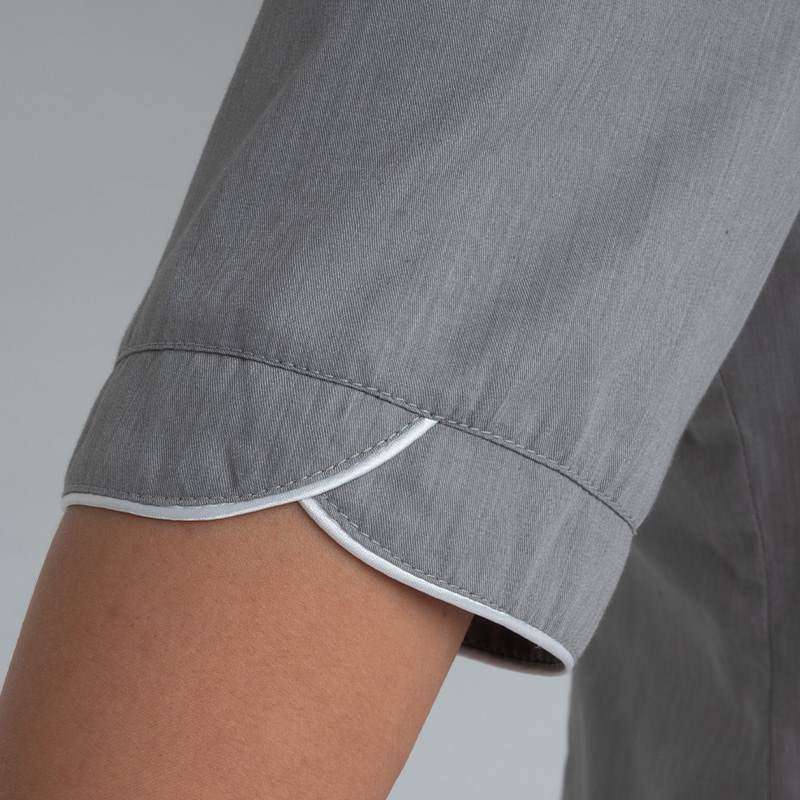 Il collo alla coreana รจ bordato da un piping a contrasto che si ripete nelle maniche e valorizza la linea del capo.