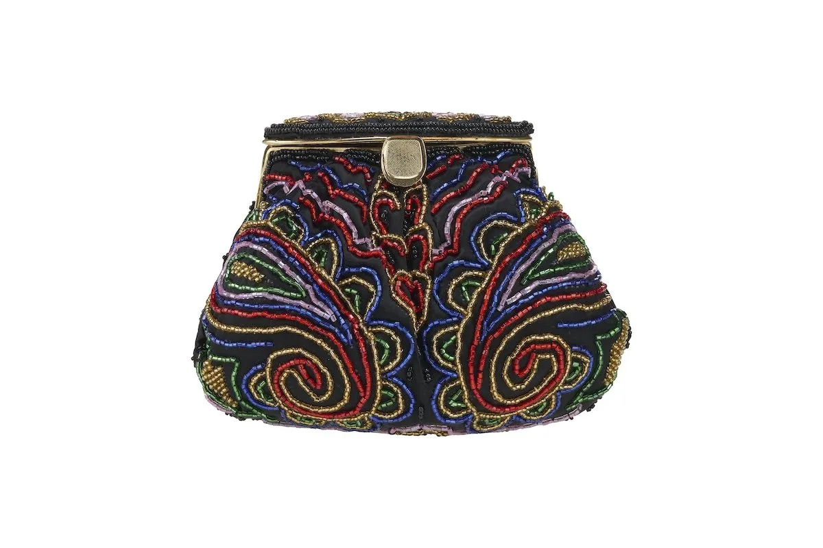 Originale e di tendenza clutch-Pouch bag con perline ricamate a mano.  Perfetta per aggiungere tocco di classe. Dotata di pratica e versatile  catena in metallo scomparsa. Base color nero e perline multicolore, parti metalliche in colore oro