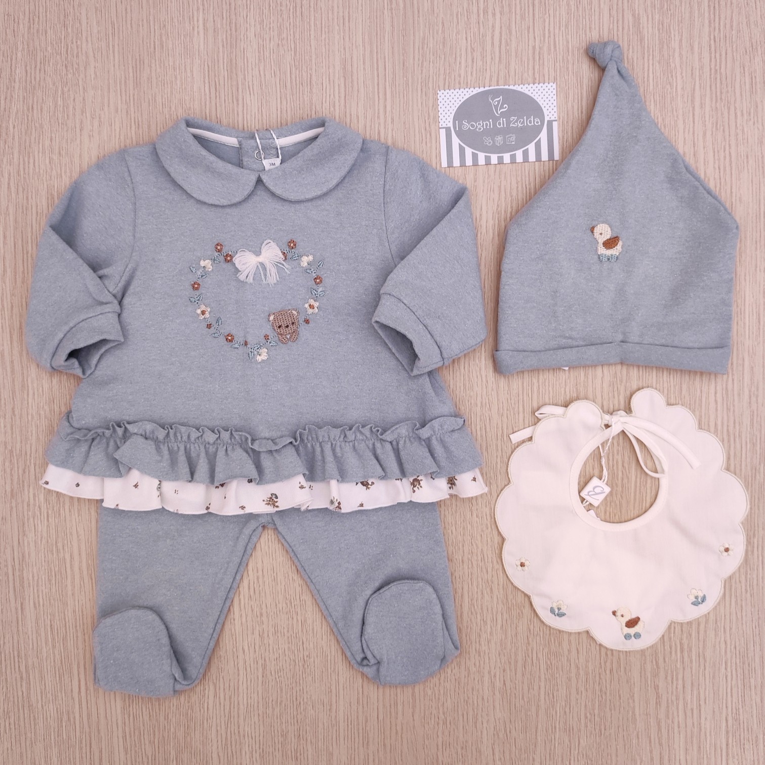Completino Barcellino – Verde Polvere Fiorellini, in caldo cotone con cappellino e bavetta 3 mesi (56 cm) – 47% cotone, 47% acrilico, 6% elastane – Made in Italy