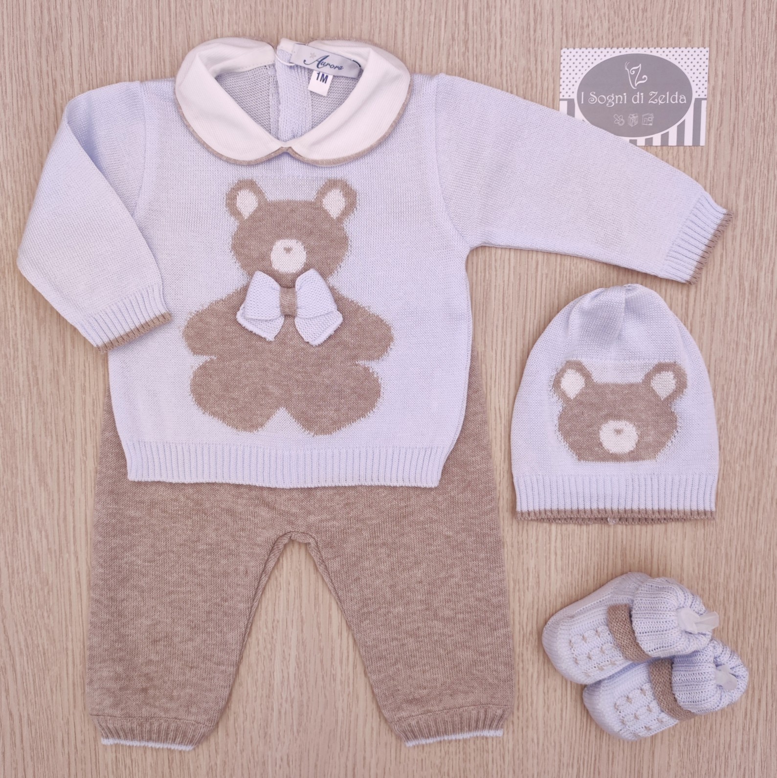 Completino nascita Aurora – Cielo/Tortora Orsetto, comprende scarpette, cappellino