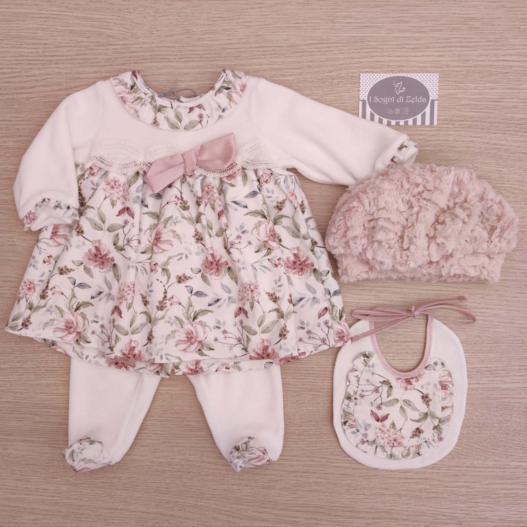Completino nascita Fiorato – Jujùbebé in ciniglia, con baschetto e bavetta