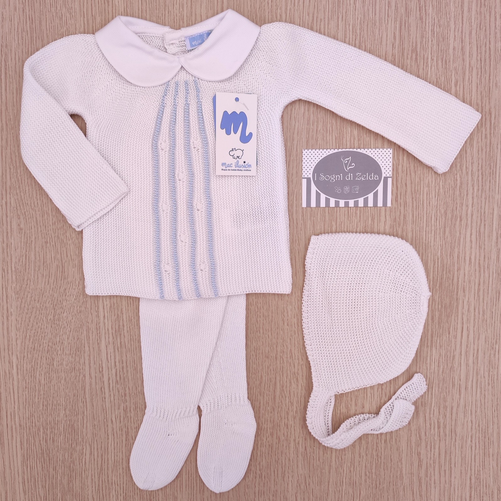 Completino nascita Mac Ilusion – Bianco/Celeste, con cuffietta