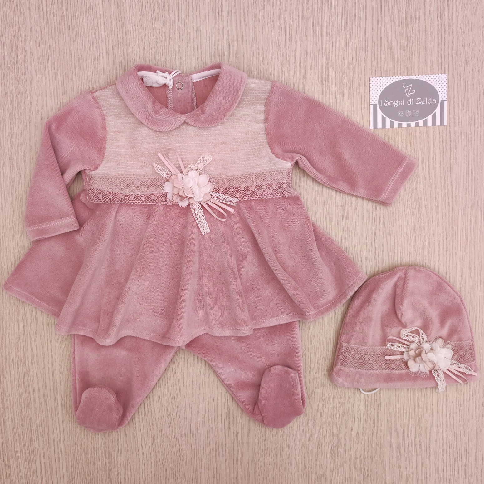Completino nascita Ninnaoh – Pizzo Rosa Antico in ciniglia con cappellino