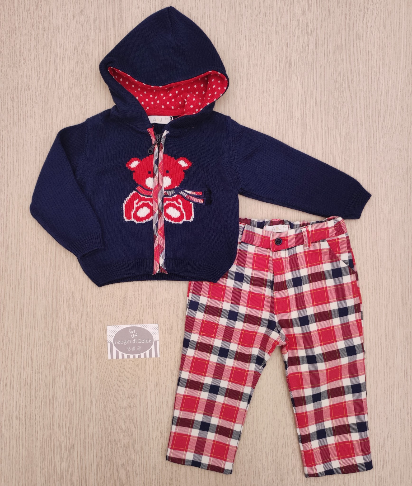 Completo A&J – Orsetto Tartan, comprende pantaloni lunghi con coulisse, maglioncino con cerniera in caldo cotone 9 mesi (74cm) – Giacchino 50% Cotone, 50% Acrilico – Pantaloni 70% cotone, 30% poliestere –Â Made in Portugal