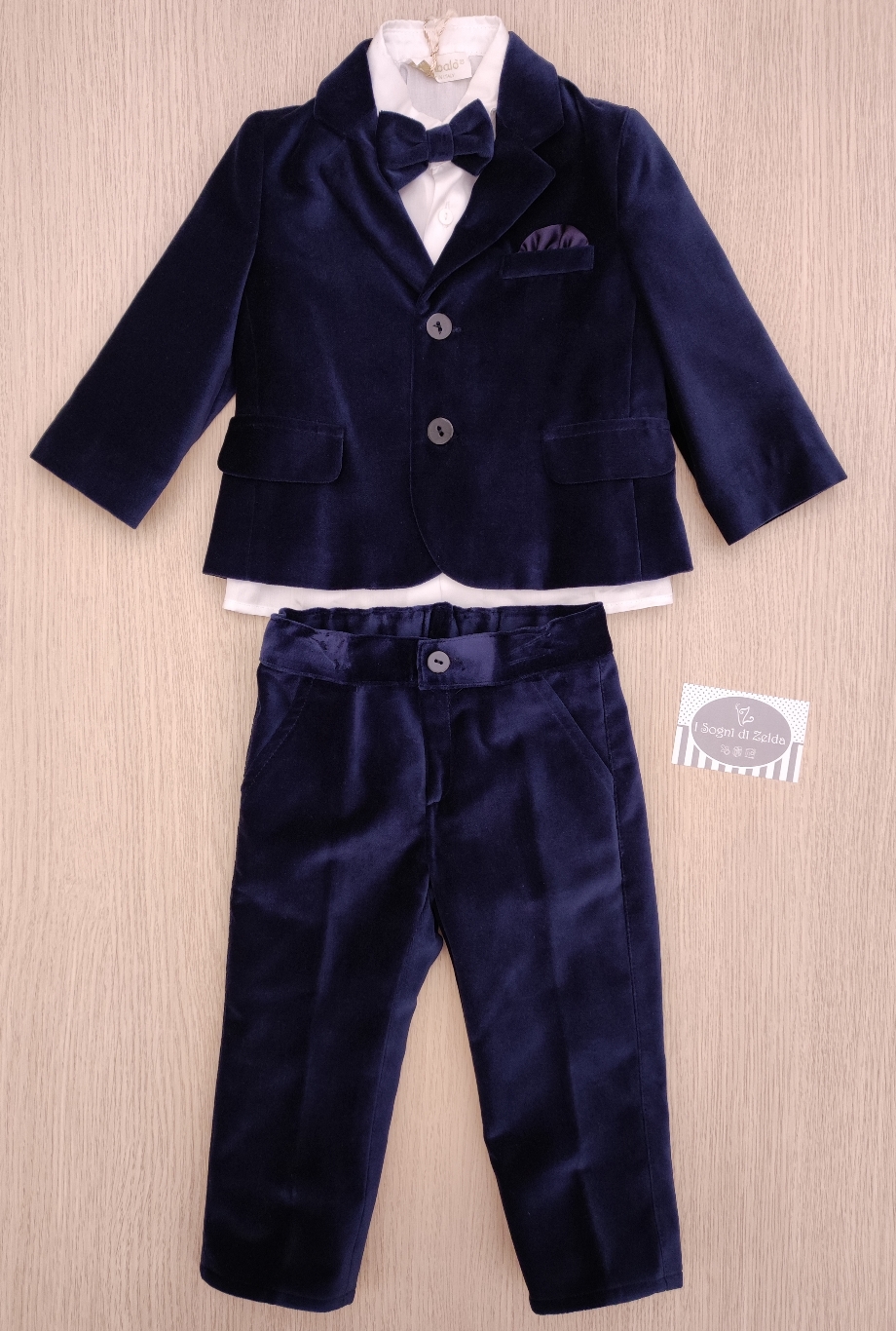 Completo Bimbalò – Velluto Blu, comprende giacca e pantaloni in caldo cotone con coulisse, camicia e papillon.
