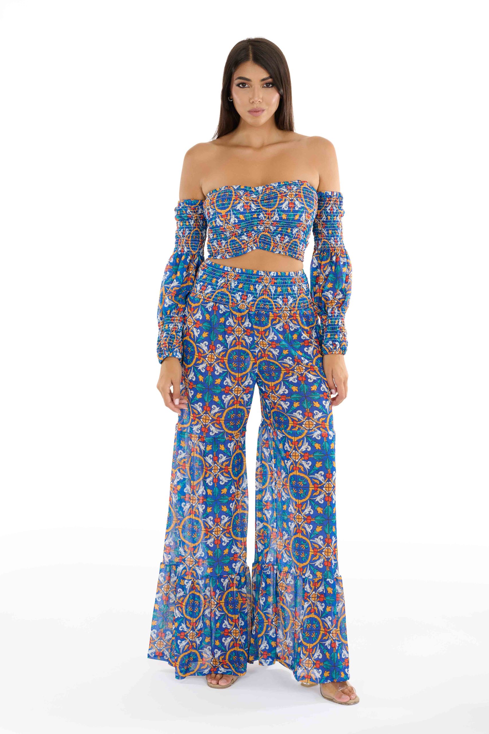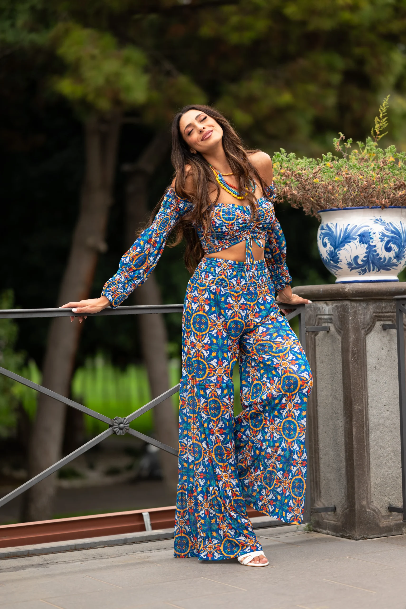 Pantalone vita alta, con fascione elastico e totalmente drappeggiato, super comfortevole e snellente. L’effetto flare termina con un elegante rouches che rende il set sofisticato e dal gusto retrò. Slancia la figura e accompagna perfettamente le linee del corpo senza stringere.