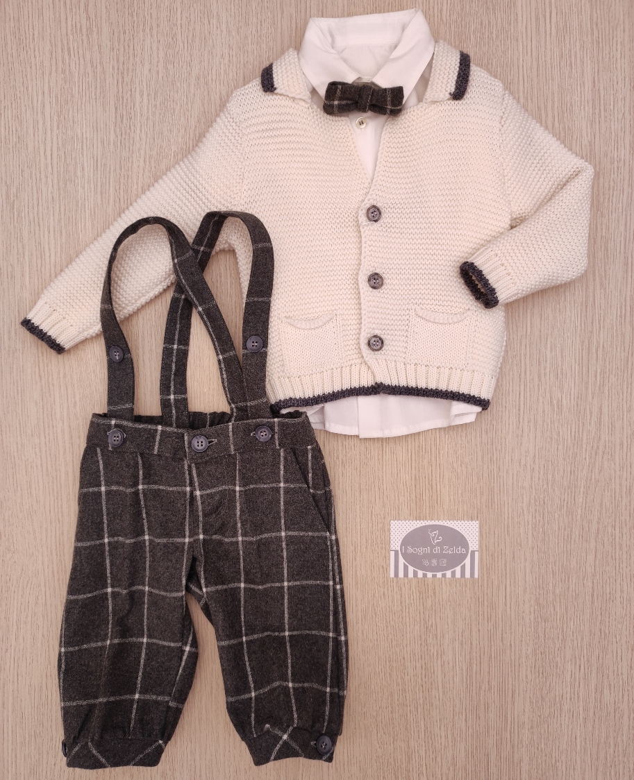 Completo Bufi – Panna/Grigio, comprende cardigan misto lana, bermuda in caldo cotone con bretelle e coulisse, camicia e papillon.