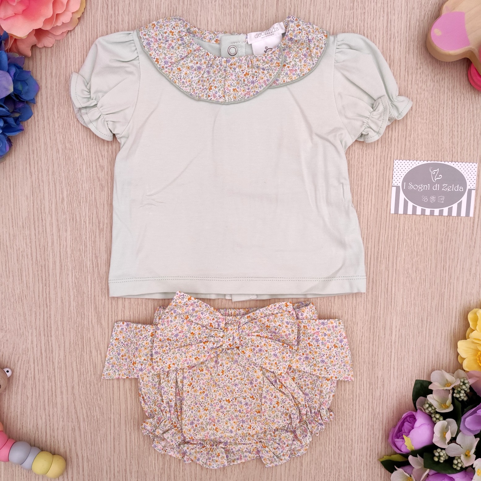 Completo corto Deolinda – Verde Fiorellini, comprende magliettina e copripannolino