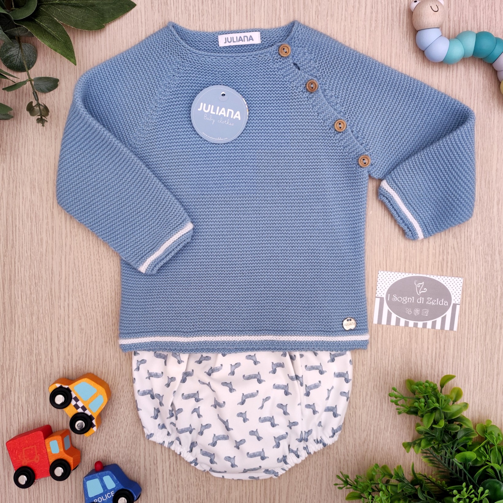 Completo corto Juliana – Azul Nube – Bassotti 18, 24, 36, 48 mesi – Sopra 100% acrilico; Sotto 100% cotone – Made in Spain cod: J8087