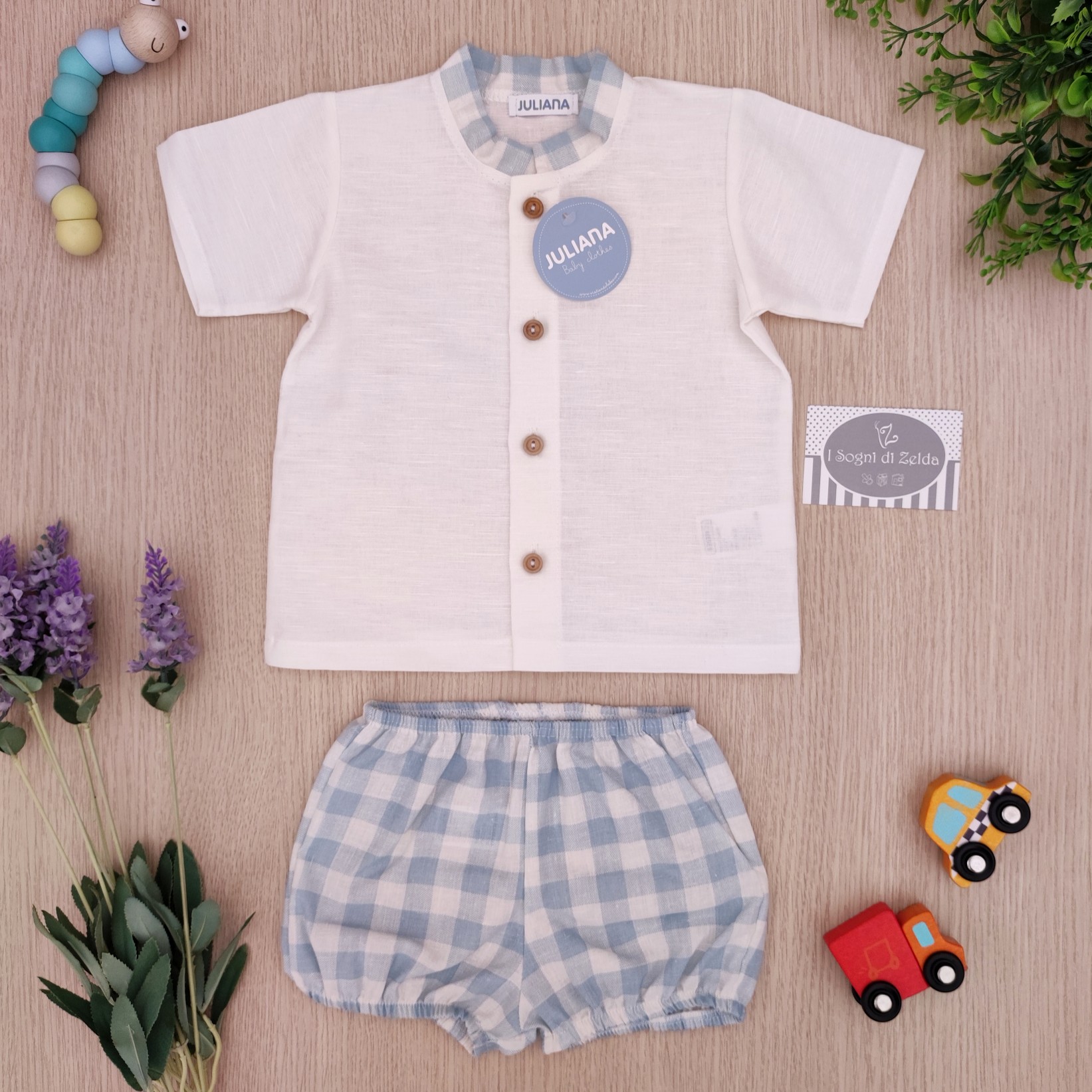 Completo corto Juliana – Quadri Verde Agua, composto da camicia e pantaloncino 12, 18, 24, 36 mesi – 50% cotone, 50% lino – Made in Spain