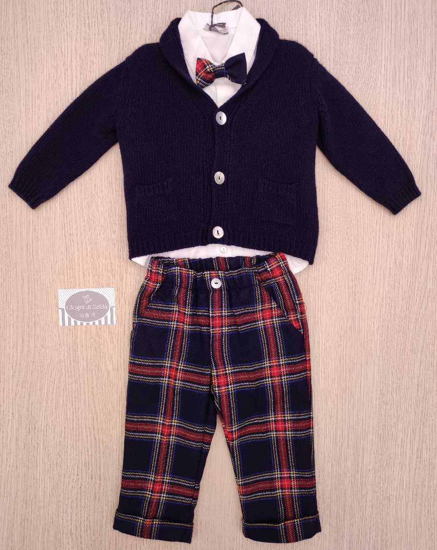 Completo J.O. Milano – Blu/Tartan, comprende cardigan e pantaloni in misto lana, camicia e papillon