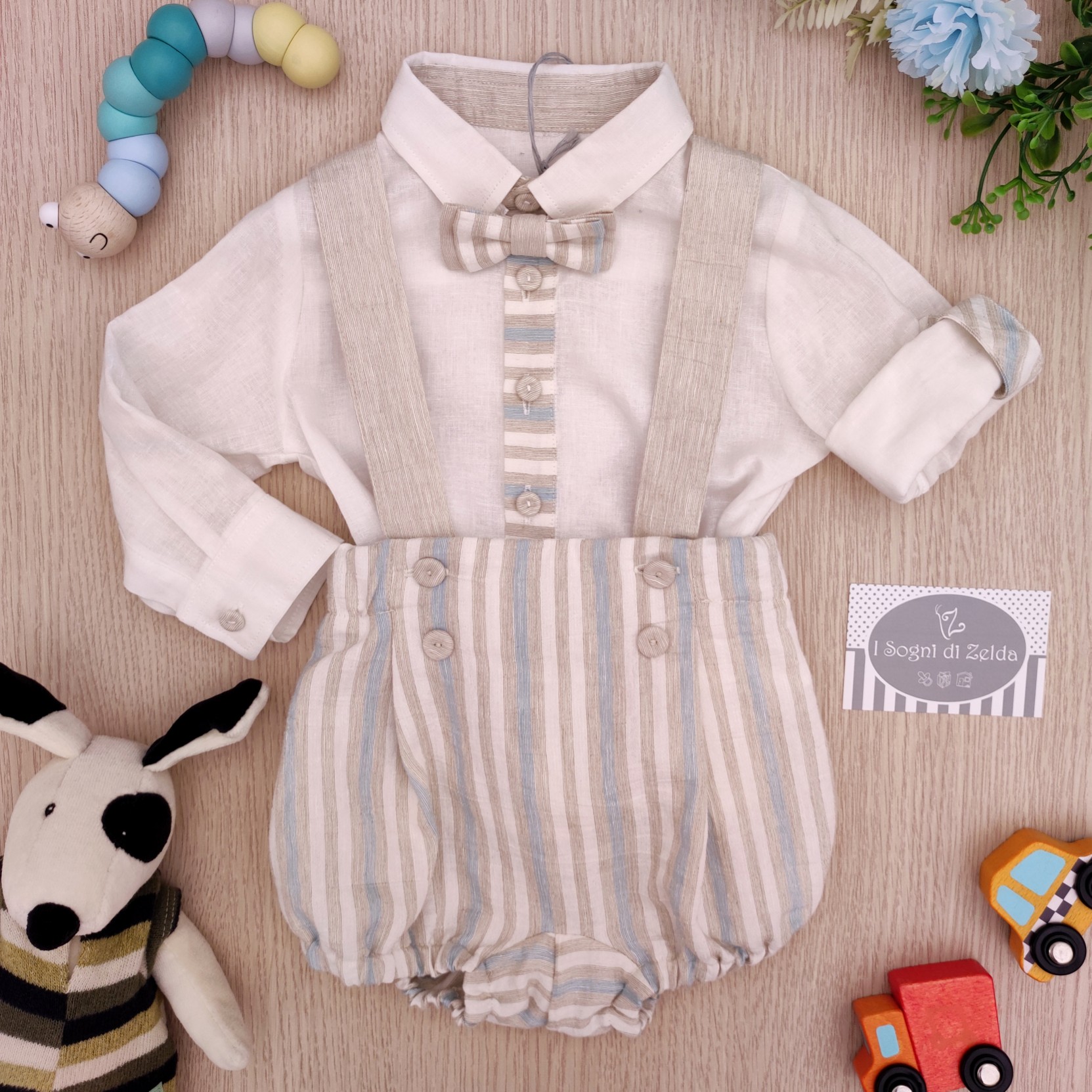 Completo Jujùbebé – Beige/Carta da Zucchero, comprende camicia maniche lunghe con fascetta, pantaloncino con bretelle e papillon 3 mesi – Camicia 55% lino, 45% cotone; Pantaloncino 46% lino, 33% poliestere, 21% cotone – Made in Italy