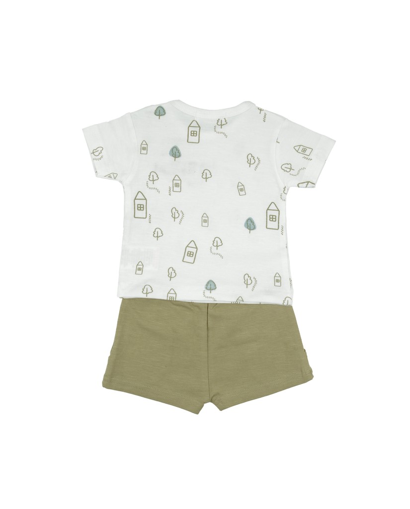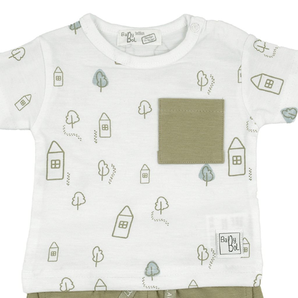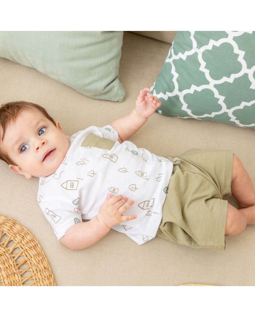 Set due pezzi per neonati, in tessuto di cotone, composto da una T-shirt stampata a maniche corte con taschino e pantaloncini in tinta unita con coulisse regolabile.