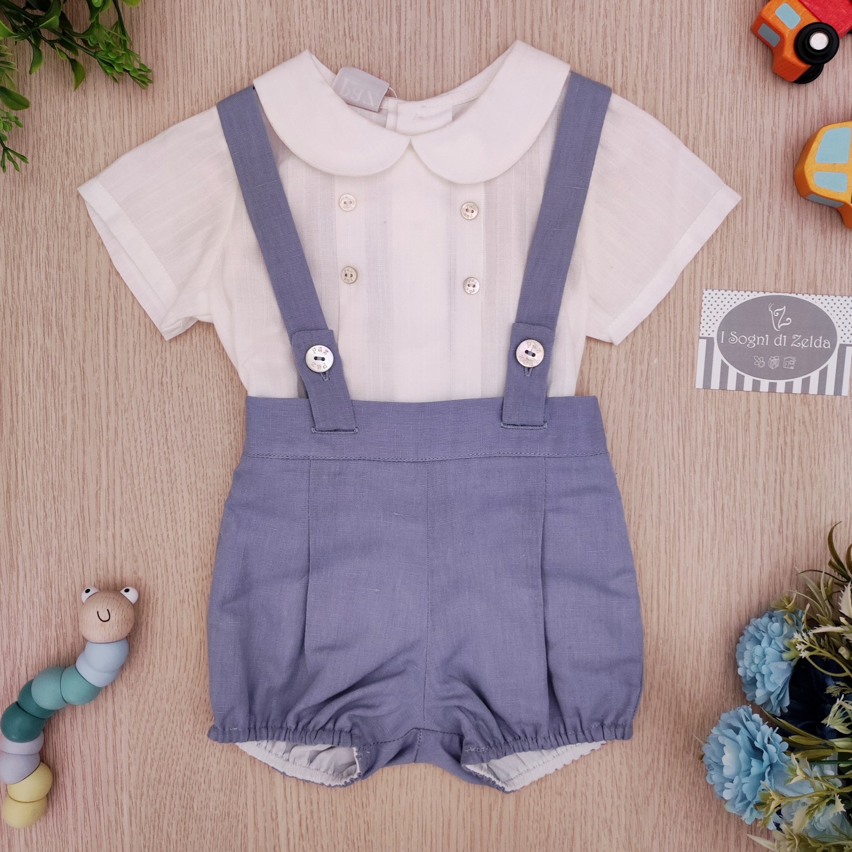 Completo Paz Rodriguez – Bianco/Azzurro Polvere, comprende camicia maniche corte, bermuda con bretelle e coulisse