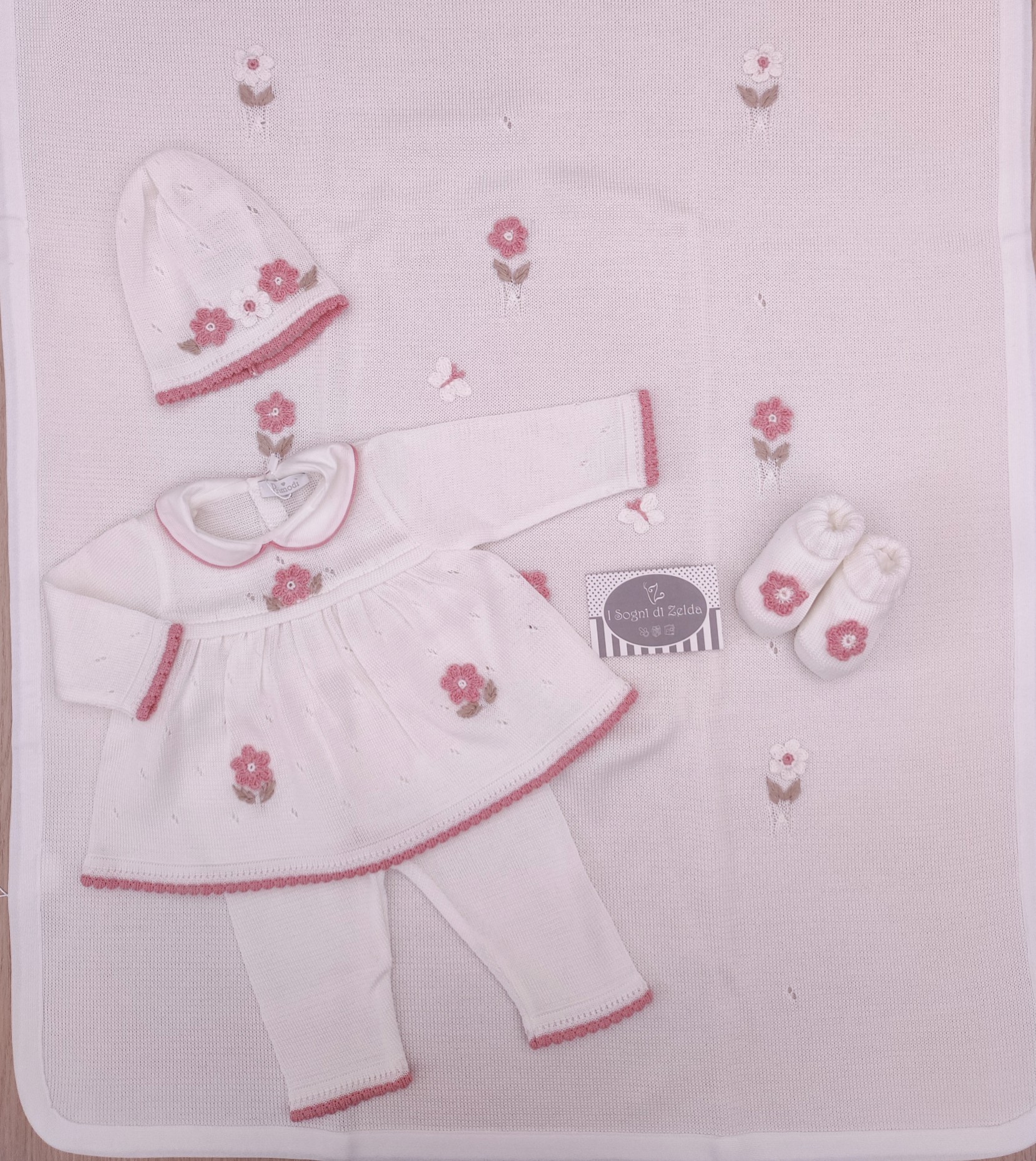Corredino nascita Primodì Bebè – Latte/Rosa Cipria/Tortora con ricami a mano, comprende completino, scarpette, cappellino e copertina scialle doppiata. 1 mese (56cm), 100% cotone, made in Italy cod. 3414