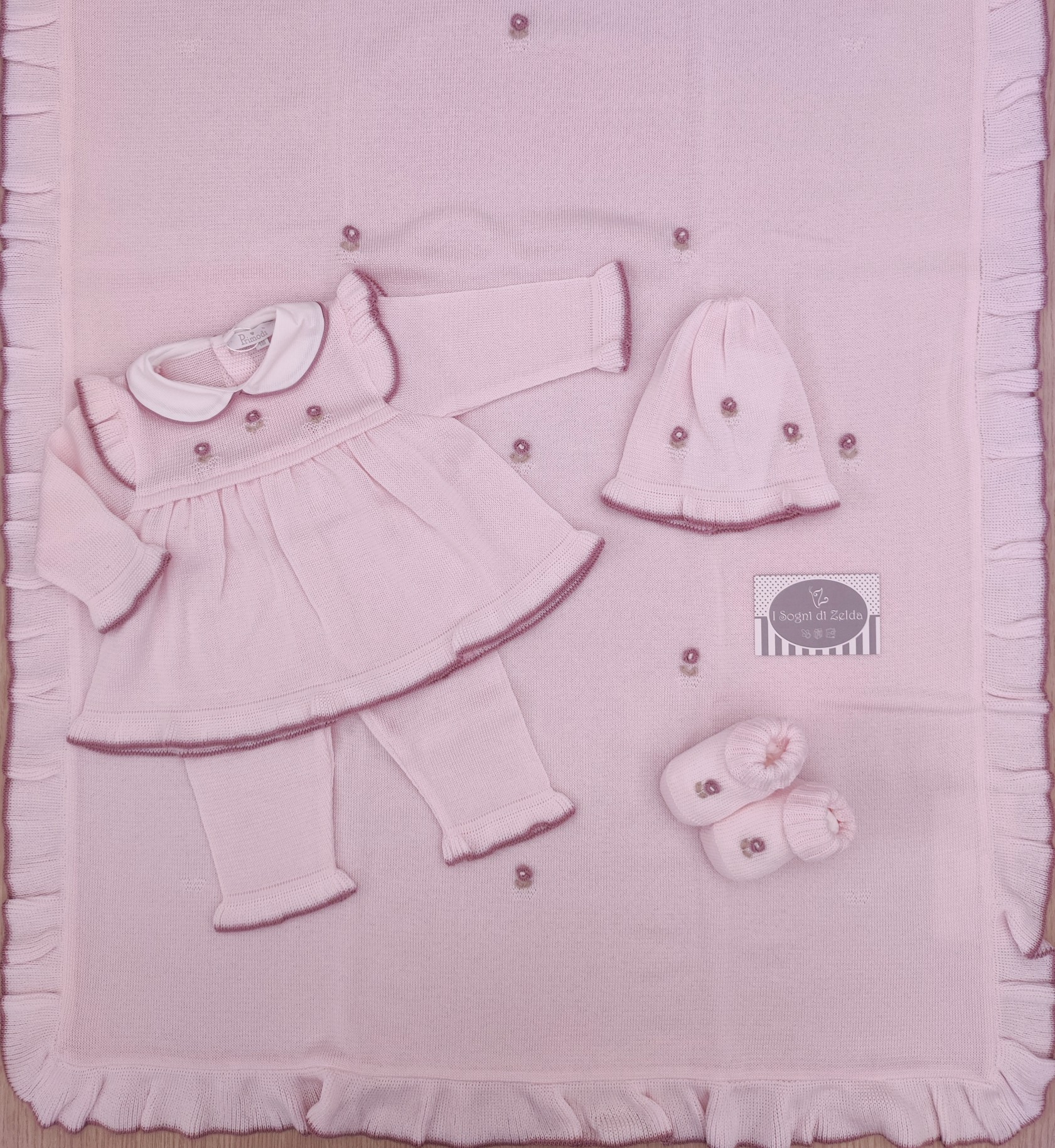 Corredino nascita Primodì Bebè – Rosa Chiaro/Quarzo con ricami a mano, comprende completino, scarpette, cappellino e copertina scialle doppiata e bordata ad uncinetto.