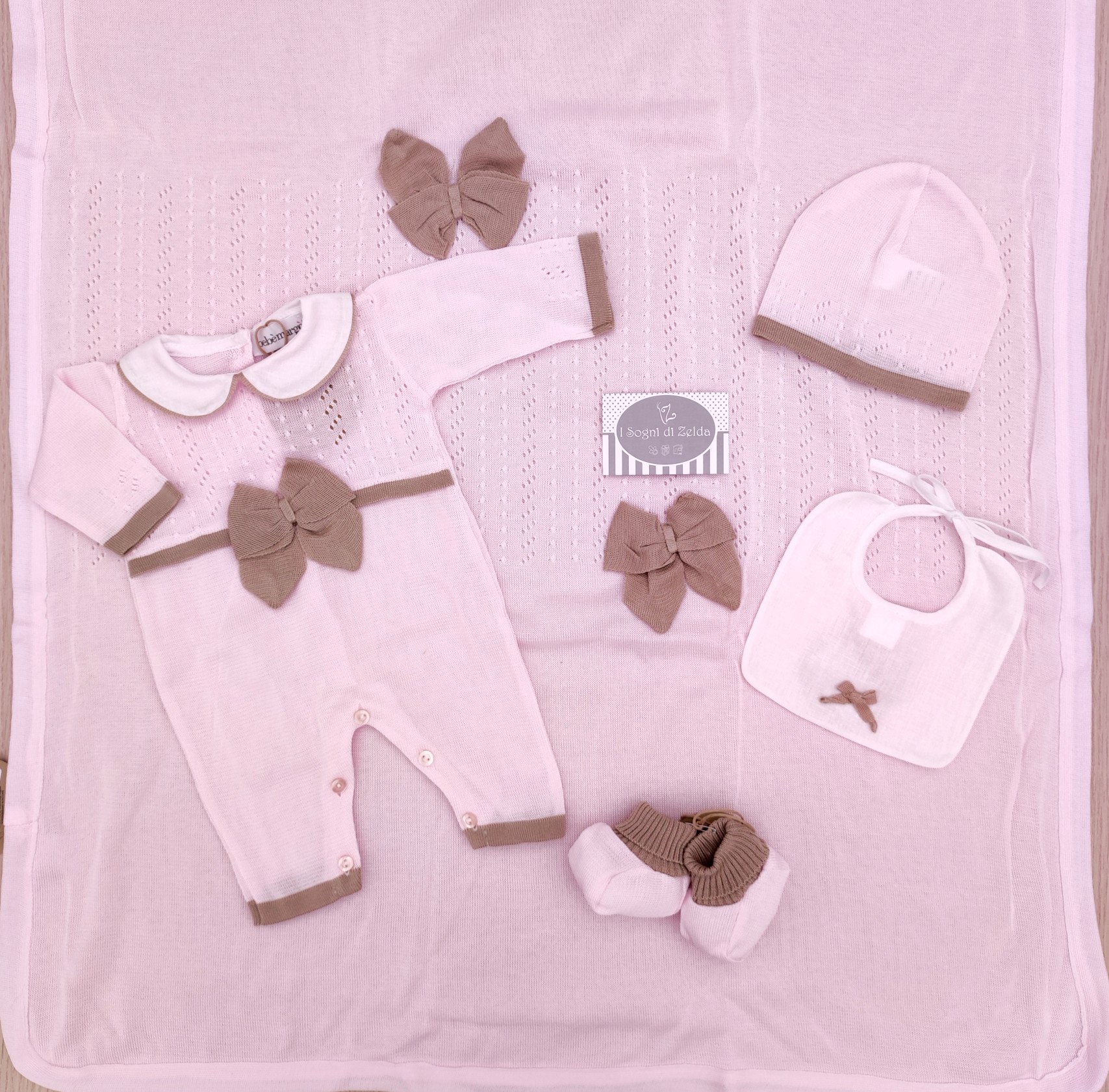 Corredino nascita Rosa Fiocco Tortora – Bebèmargò, comprende coperta doppiata, tutina, scarpette, cappellino, bavetta.